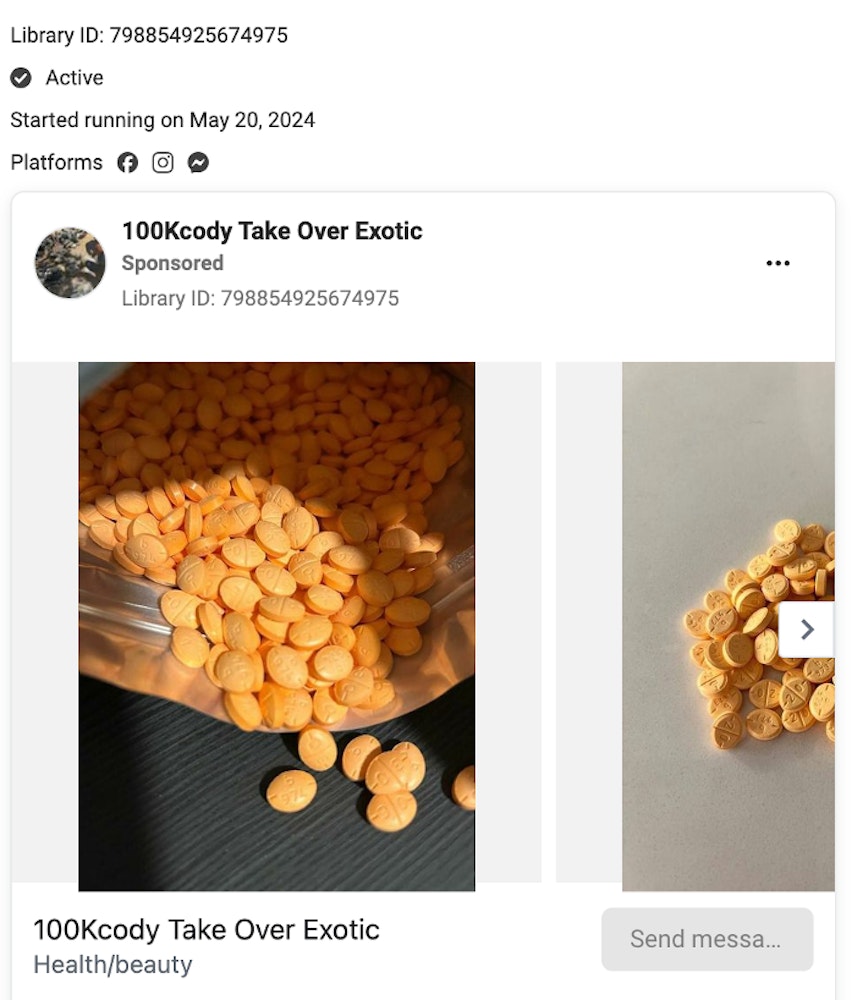 Asked for comment about TTP's findings, a Meta spokesperson said, “Drug dealers are criminals who work across platforms and communities, which is why we work with law enforcement to help combat this activity. Our systems are designed to proactively detect and enforce against violating content, and we reject hundreds of thousands of ads for violating our drug policies."