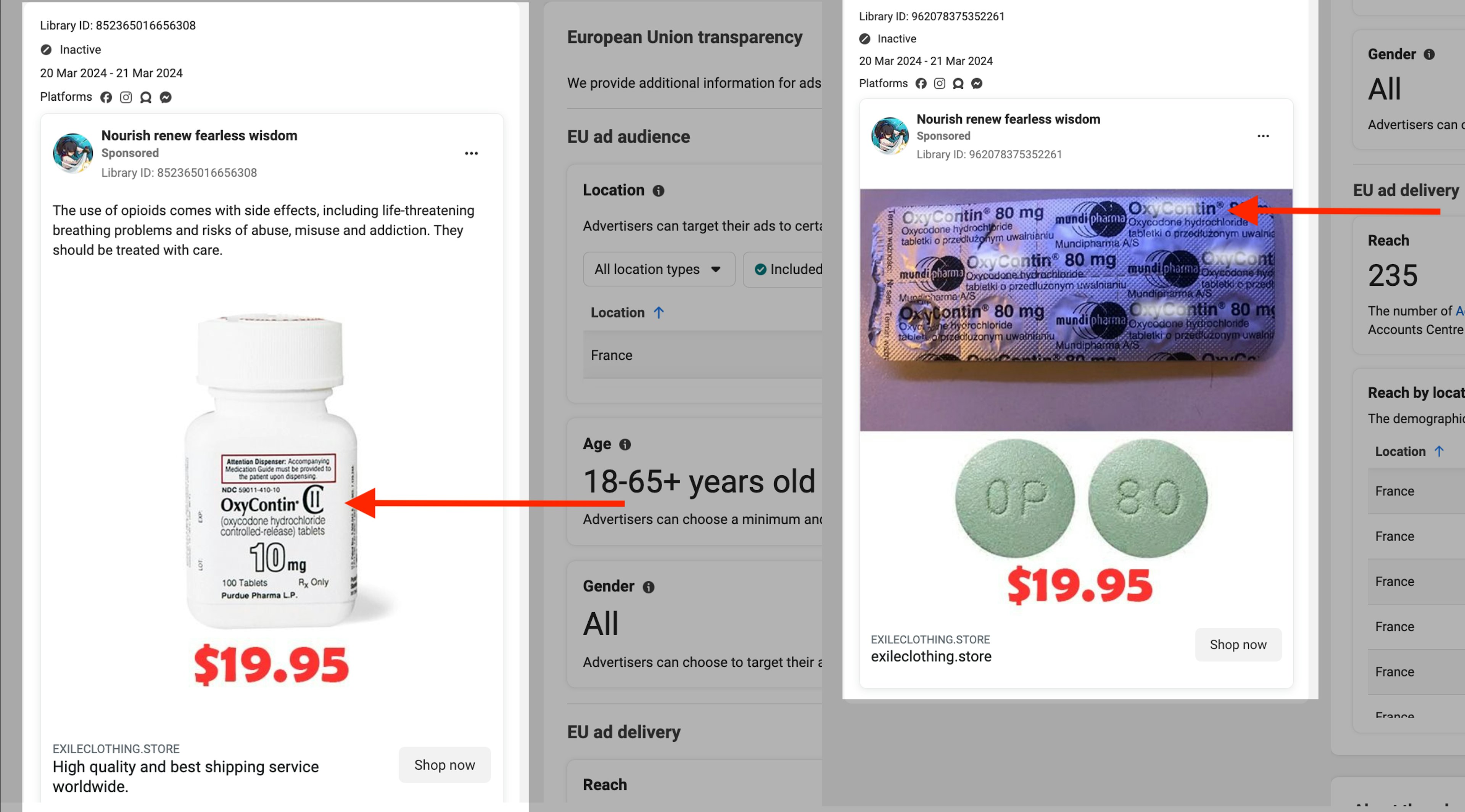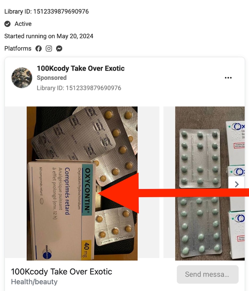 An ad that ran on Facebook, Instagram, and Messenger showed a carousel of drug images including packages of OxyContin.
