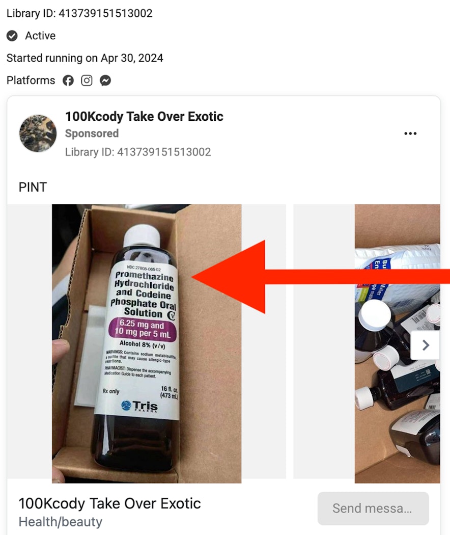Many of the ads identified by TTP offered drugs on multiple Meta platforms. For example, one account ran ads on Facebook, Instagram, and Messenger on May 20, 2024, showing packages of OxyContin and piles of unidentified, brightly colored pills. The same account ran an ad the previous month for prescription cough syrup containing promethazine and codeine, which is used to make the homebrew mixture “lean.” OxyContin (a brand name for oxycodone) and codeine are opioids, a highly addictive class of drugs that is driving the drug overdose crisis the U.S.