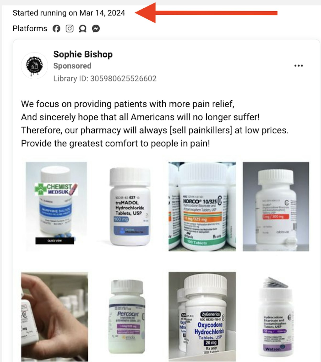 The same Sophie Bishop page ran an ad starting March 14 that showed an array of prescription drugs including Norco, tramadol, oxycodone under various brand names, and Percocet, which combines oxycodone and acetaminophen. The ad, which pointed to the same online store as the previous ad, stated, “We focus on providing patients with more pain relief” and “sincerely hope that all Americans will no longer suffer!” Touting its pharmacy’s low prices, it ended with, “Provide the greatest comfort to people in pain!” The ad ran on Facebook, Instagram, Messenger, and Meta’s Audience Network.