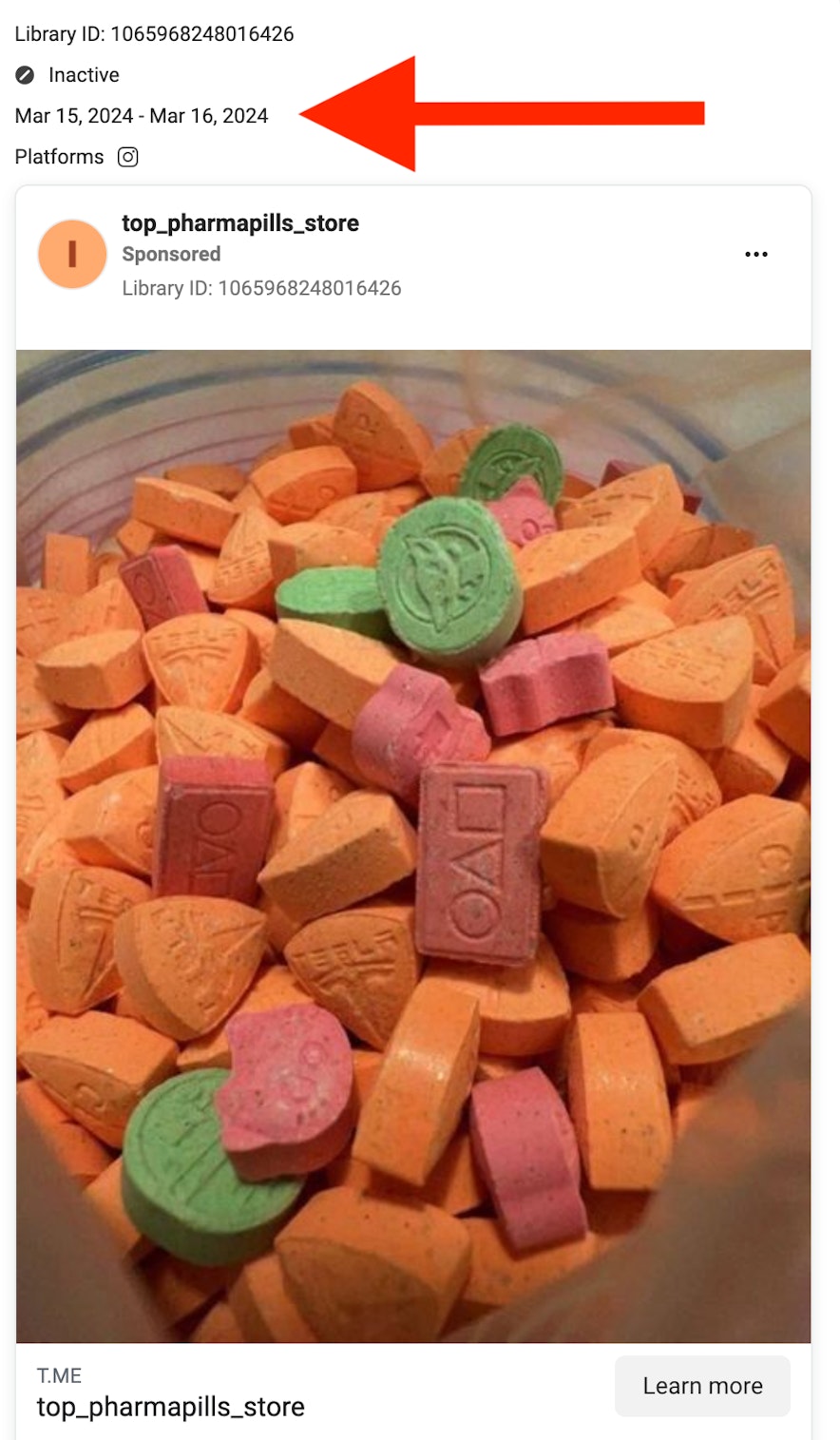 Because of the limitations of Meta’s Ad Library, TTP likely captured only a fraction of the drug ads that ran in the March-June time period covered by this report. According to Meta, the Ad Library only shows ads that are actively running on its platforms, with the exception of ads about politics, elections, or social issues, which it stores for seven years, and ads that run in the European Union, which it stores for a year. That means many ads on Meta platforms simply disappear from the Ad Library once they are no longer active, and there is no way to track them. TTP did not monitor the Ad Library continuously during its investigation, so the drug dealer ads it identified are in all likelihood an undercount.