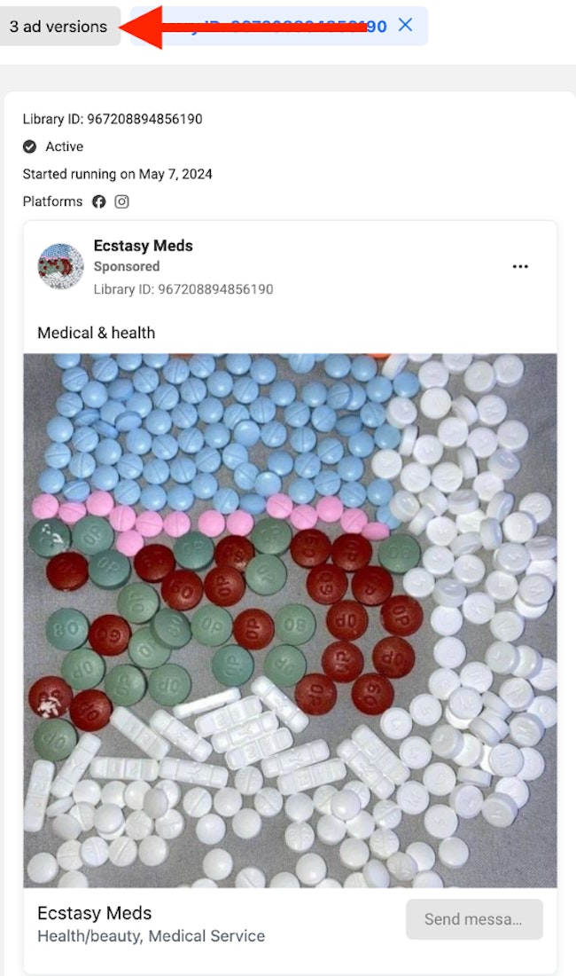 Some advertisers even used the name of a drug in their name. For example, a Facebook page called “Ecstasy Meds” ran ad for pills on Facebook and Instagram starting on May 7, 2024. The account ran two other ads with the same content, the Ad Library shows.
