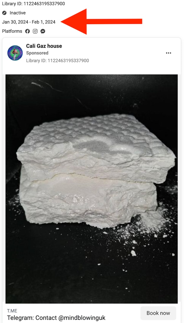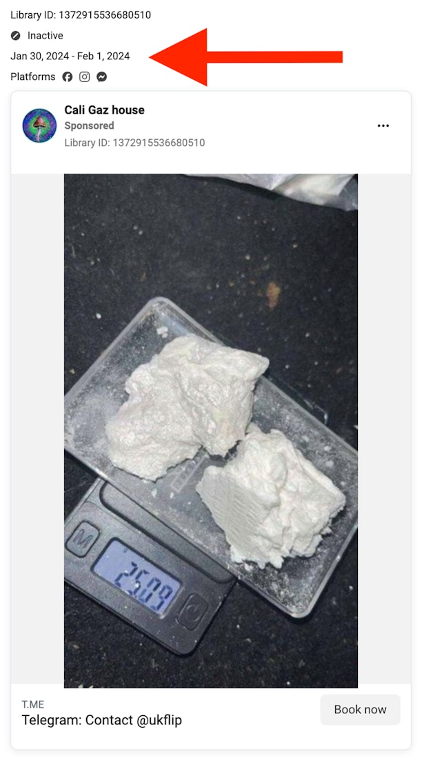 That same day, Meta ran two ads on Facebook, Instagram, and Messenger for chunks of a white powdery substance that appeared to be cocaine. The ads directed users to contact the dealer via Telegram accounts, including one called “Trippy house uk 🇬🇧 base 💊." The Facebook page behind the ads, “Cali Gaz House,” is filled with images of drugs and had a cover photo at one point that read, “Order Pay Receive.”