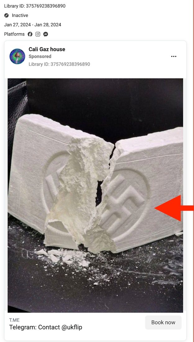 The page has run at least six similar ads, including one showing what looks like a cocaine brick stamped with a Nazi swastika symbol.