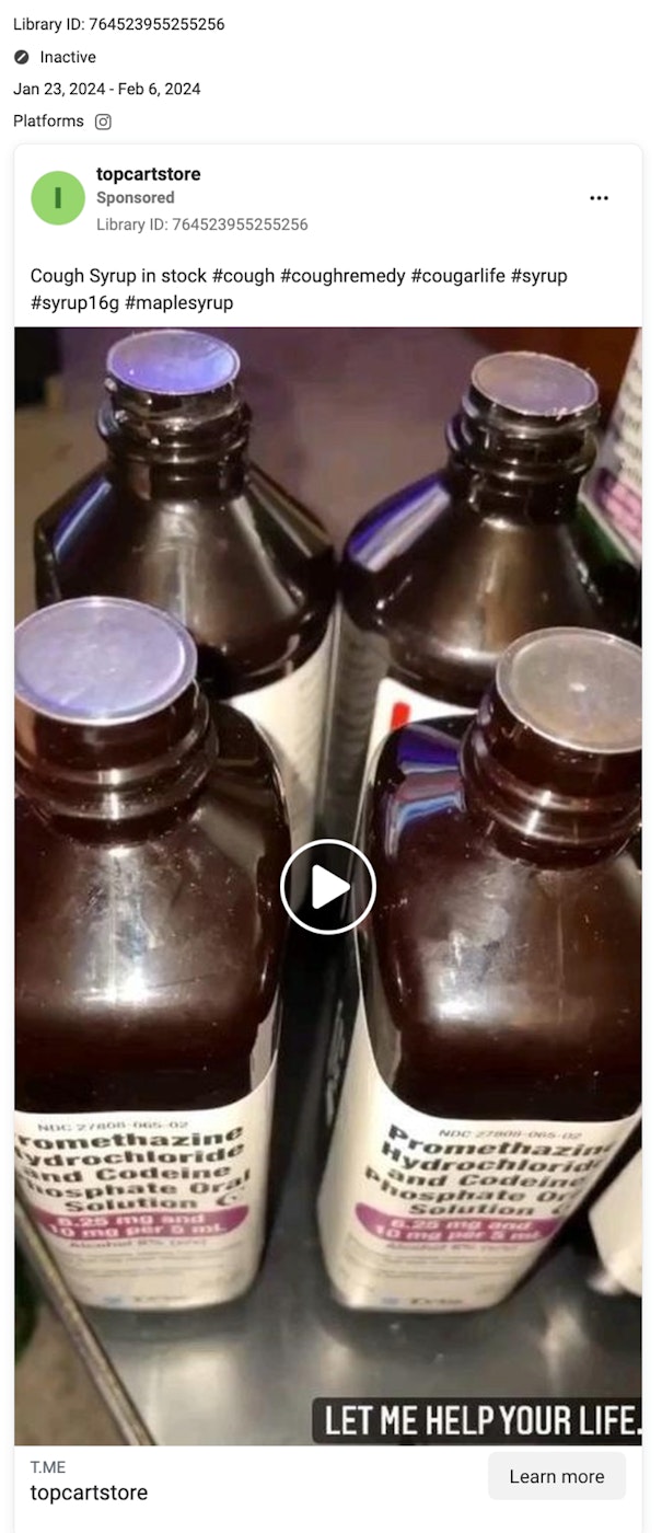 An Instagram ad showing codeine cough syrup pointed to a Telegram account called “topcartstore.”