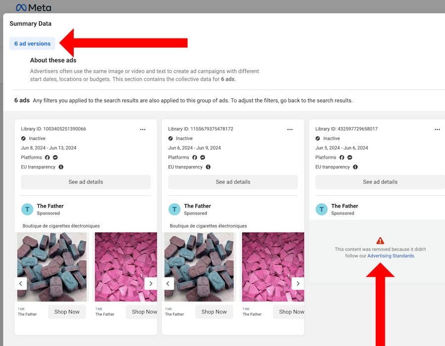 One set of six identical ads that ran on Facebook and Messenger in June 2024, showing a carousel of images of brightly colored pills and linking to a Telegram account, reached 192,831 users in 18 EU member states and regions, including France, Germany, and Italy, according to the Ad Library. The Library shows that Meta removed one of the ads for violating its advertising standards for Unsafe Substances but left the others alone. It was not clear why Meta took action on just one of the ads. The ads and the Facebook page behind them, called “The Father,” identify themselves as an electronic cigarette store.