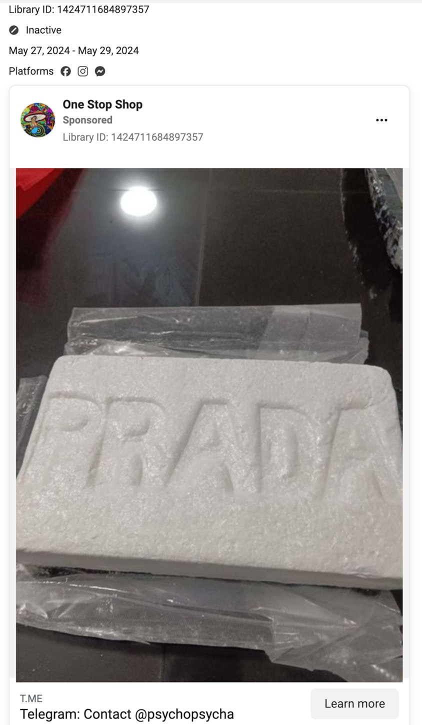 TTP also identified a Facebook page called “One Stop Shop” that ran 50 ads showing the same photo of what appears to be a brick of cocaine stamped with the word “PRADA.” (Prada-branded cocaine is associated with the Mexico-based Sinaloa drug cartel, though it is not clear if the cartel was involved in this ad campaign.) According to Meta’s Ad Library, the ads, which ran in the UK and EU between March and June 2024, reached a collective 117,959 users in EU countries including Ireland, Austria, and the Czech Republic.