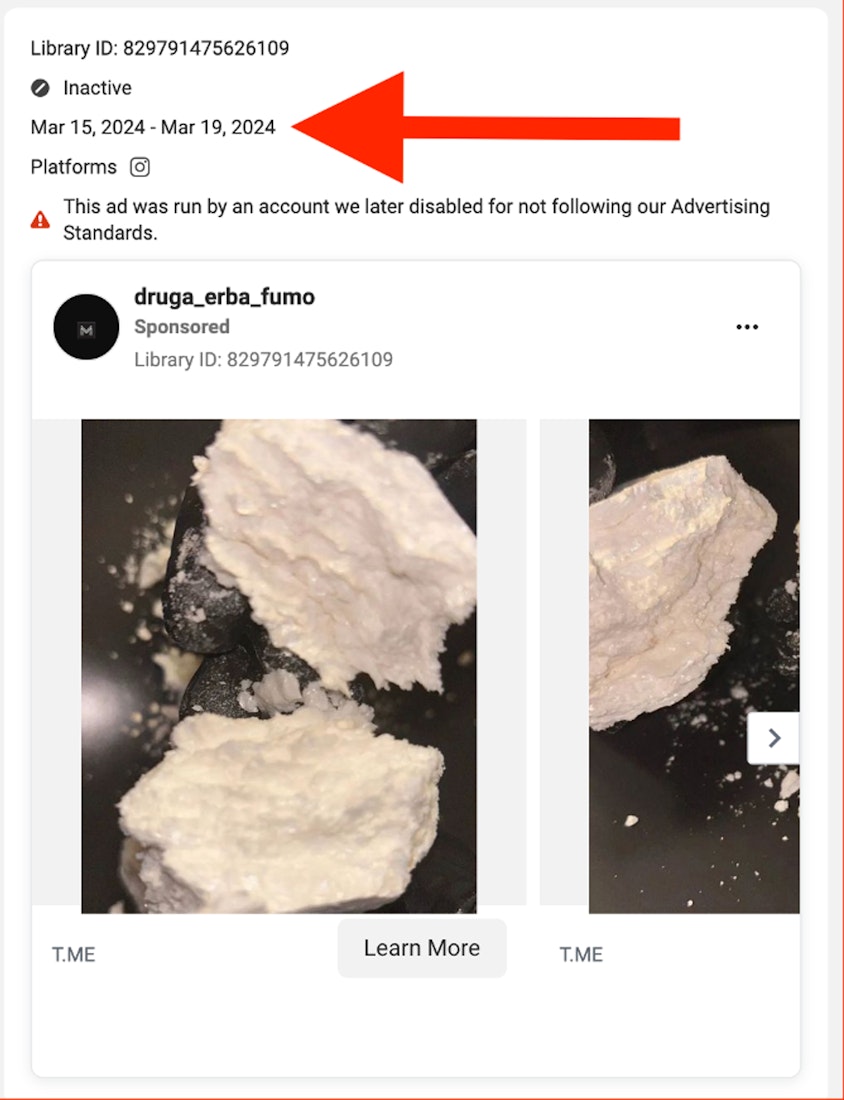 Meanwhile, an ad from the Instagram account @druga_erba_fumo, which showed what looks like cocaine, ran from March 15-19, 2024, in the EU. According to the Meta Ad Library, the ad reached more than 7,800 male users aged 23 to 56 in Italy. While the Ad Library shows a warning that the ad “was run by an account we later disabled for not following our Advertising Standards,” the Instagram account @druga_erba_fumo, which is filled with images of drugs and boasts that it offers the “best online shopping experience,” remains active. (“Erba fumo” translates to “smoke weed” in Italian.)