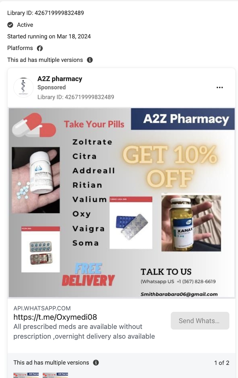 One ad identified by TTP promoted something called “A2Z Pharmacy.” The ad, which ran on Facebook, Instagram, Messenger, and Meta’s Audience Network starting on April 27, 2024, showed a white tablet with the text, “Take Your Pills,” and a list of drugs including Xanax, Valium, Percocet, OxyContin, tramadol, Adderall, and fentanyl. The ad, from a Facebook page called “Nutragreen,” promised “Overnight and Free Delivery” and “Order Now And Get 50% Off.” It connected to a WhatsApp number.