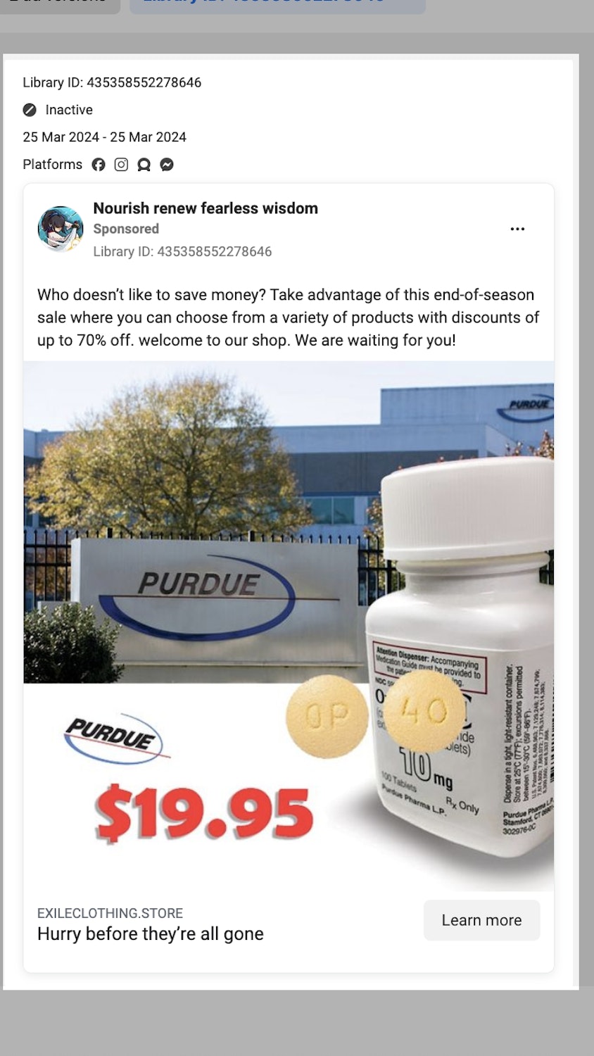 Another ad that ran on all four Meta platforms March 24-25, 2024, showed a prescription pill bottle and pills superimposed over a photo of a Purdue Pharma corporate building. (Purdue Pharma is the maker of OxyContin.) The text read, “Who doesn’t like to save money? Take advantage of this end-of-season sale where you can choose from a variety of products with discounts of up to 70% off.” The ad linked to an online store.