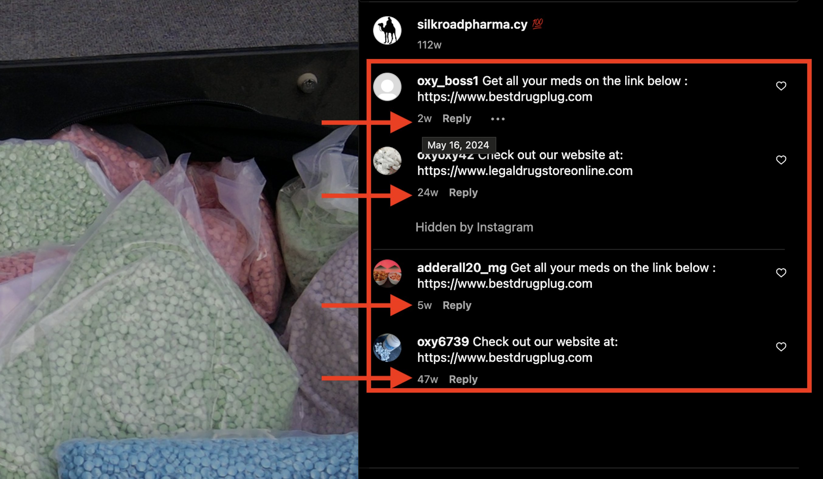 As of June 2024, TTP found that seven of the 50 accounts behind those drug dealing posts remain present on Instagram. One of the remaining accounts, with the handle @silkroadpharma.cy, has been inactive since 2022, but its old posts continue to draw other drug dealers looking for buyers. (The account’s name refers to the notorious dark web marketplace known as the Silk Road.)