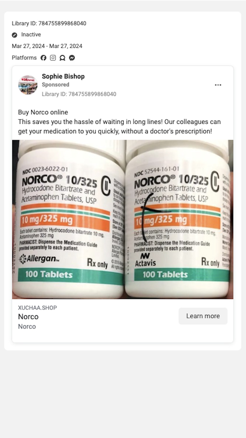 One ad that ran on March 27, 2024, showed bottles of the prescription drug Norco, a painkiller that combines the opioid hydrocodone and acetaminophen. The text read, “Buy Norco online. This saves you the hassle of waiting in long lines! Our colleagues can get your medication to you quickly, without a doctor's prescription!” The ad ran on Facebook, Instagram, Messenger and Meta’s Audience Network of mobile apps. The Facebook page behind the Norco ad, which uses the name “Sophie Bishop,” has a cover photo and profile image of a CVS pharmacy store and gives its location as Huzhou, China. The page posted a collage of photos including a smiling pharmacist and bottles of prescription drugs including morphine, oxycodone, and the synthetic opioid fentanyl. The ad linked to an online store that has since been deactivated.
