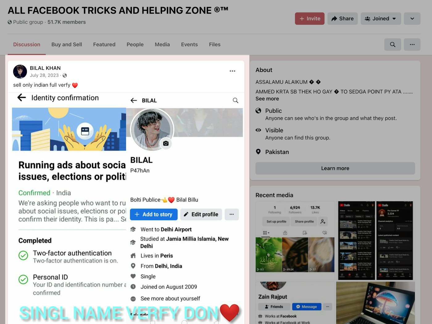 In one group called “ALL FACEBOOK TRICKS AND HELPING ZONE®©™,” a seller offered Facebook accounts in July 2023, with screenshots showing the accounts were authorized to run political and election ads in India. The Facebook group—which gave its location as India, Pakistan and the Philippines, and had more than 51,000 members—hosted a thriving trade in all things social media, including fake Instagram followers, fake WhatsApp numbers, and American IDs. It appears to have been deleted since TTP conducted its initial research, but at least a dozen other groups with the same name continue to operate on Facebook.