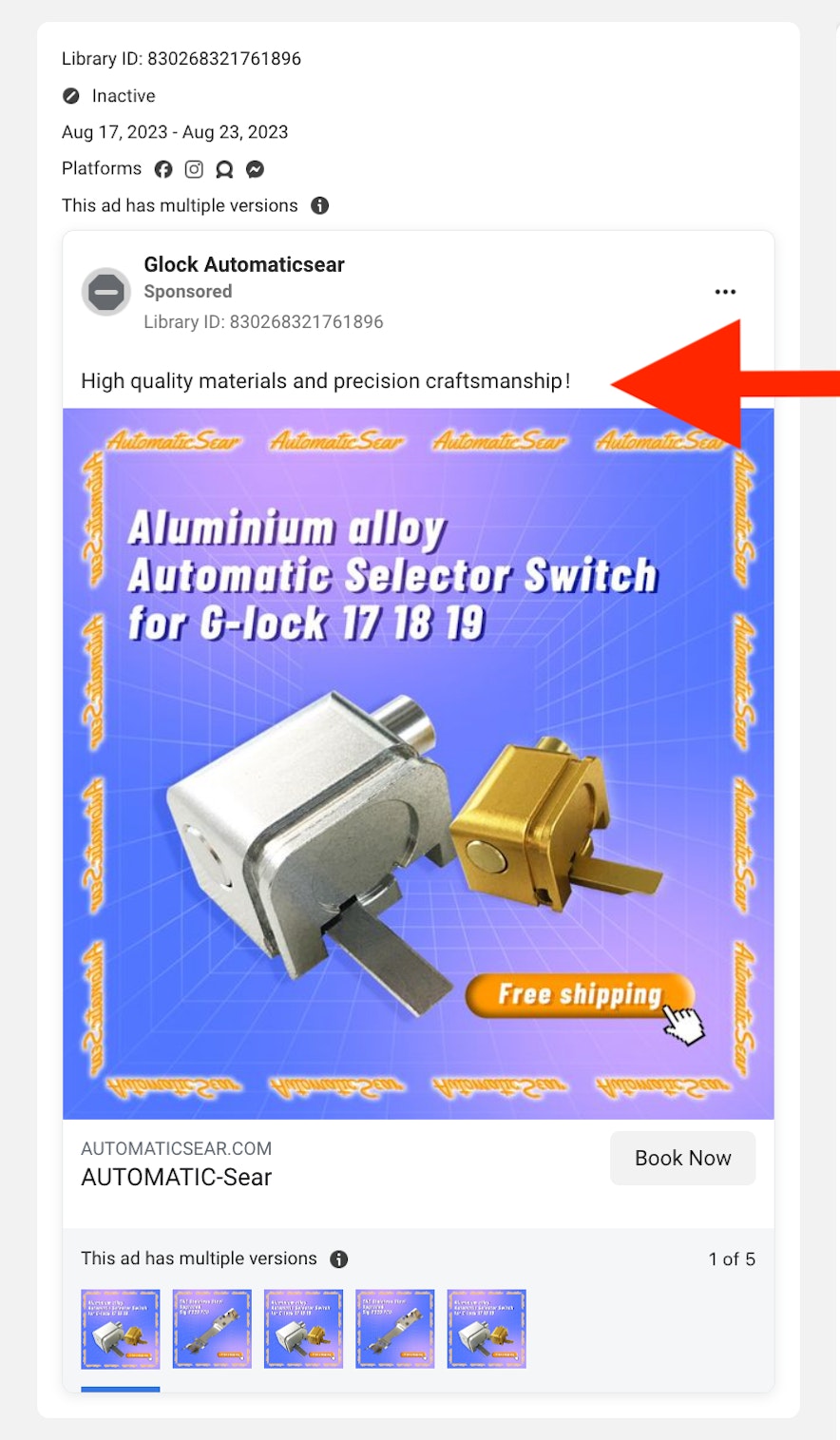 Another ad from the same account that ran on all four Meta platforms in August 2023 promised “free shipping” for switches made with “precision craftmanship.” It linked to the same automaticsear.com site. The Ad Library showed that Meta removed three ads from “Glock Automaticsear” for violating its advertising standards, but it’s not clear why the company allowed the others to proceed, given that they were all clearly selling switches.