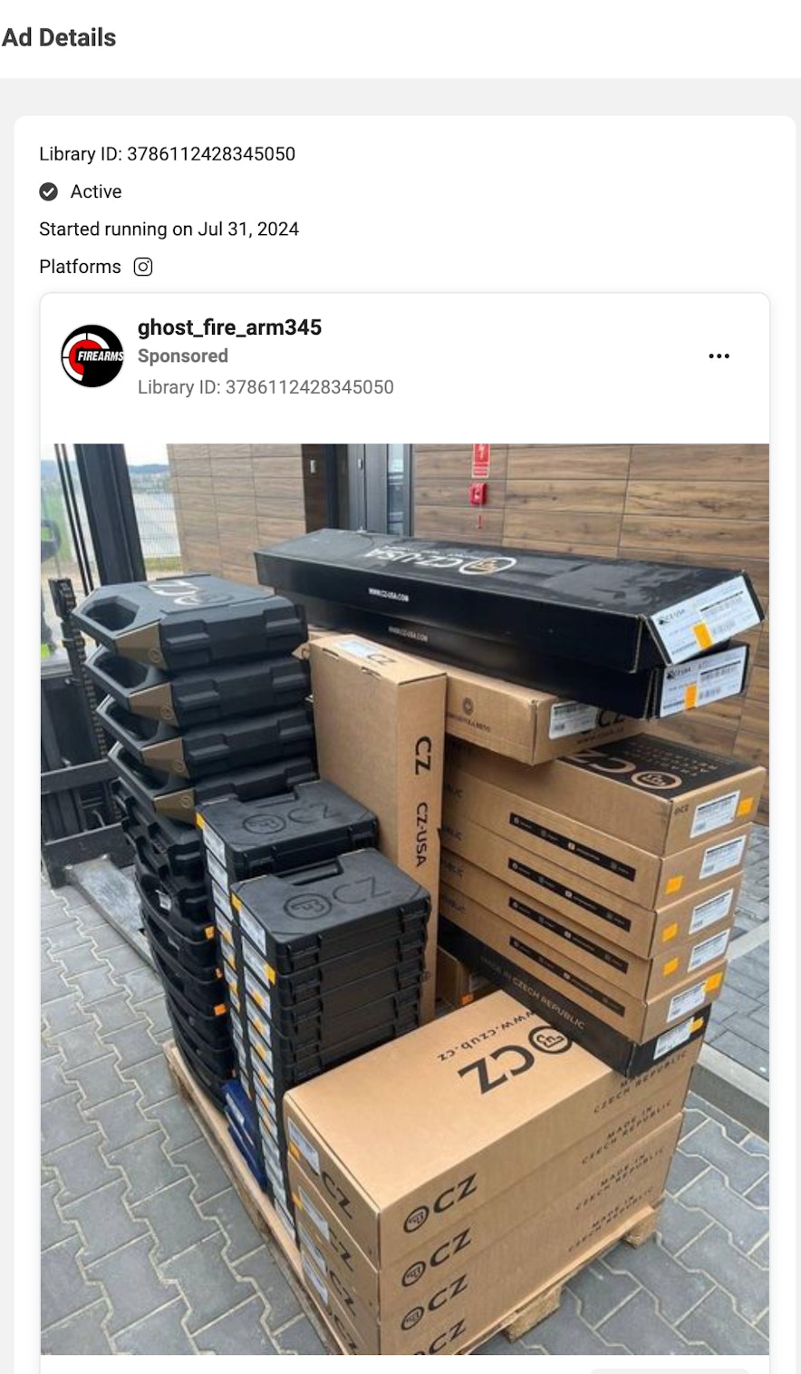 An account called “ghost_fire_arm345" ran this Instagram ad in July 2024.