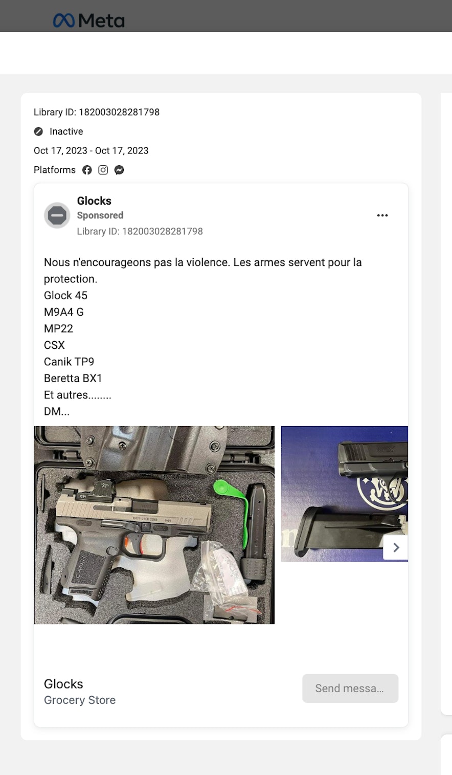 One ad in French that ran on Facebook, Instagram, and Messenger in October 2023 gave a list of firearms and a button to contact the seller via Messenger.