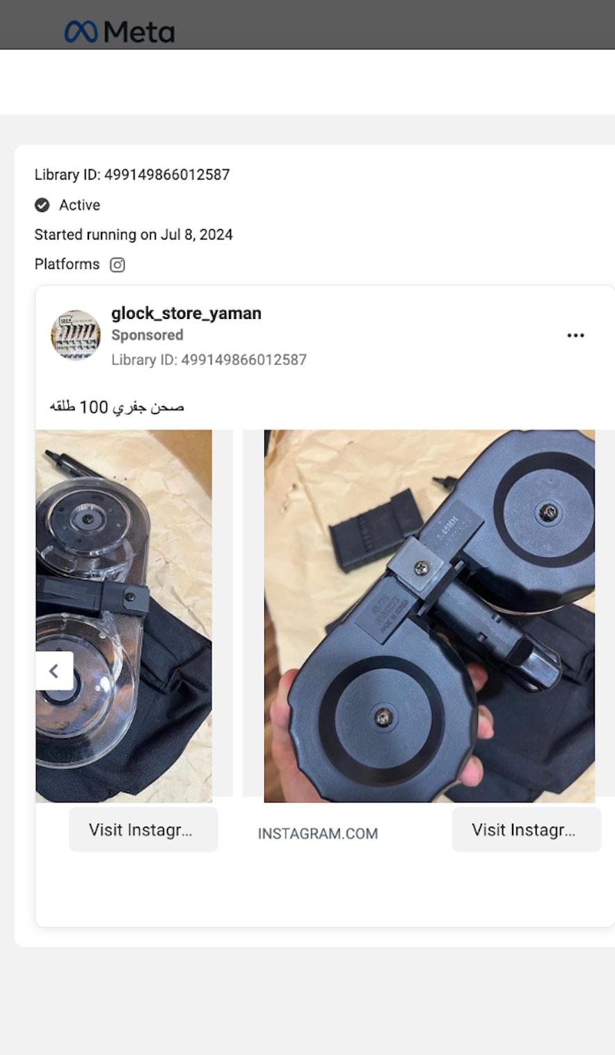 Another Instagram ad that started running July 8, 2024, offered, in Arabic, a “100-round magazine” and showed images of drum magazines. The ad linked to an Instagram profile called “glock_store_yaman,” which calls itself a “Glock Store for hidden military missions” and gives an address in Sanaa, the capital of Yemen. The profile was full of photos and short-form Reels videos of handguns and rifles. Many of the posts directed users to the store’s address in Sanaa. (Yemen has experienced years of civil war that has left more than 150,000 people dead.)