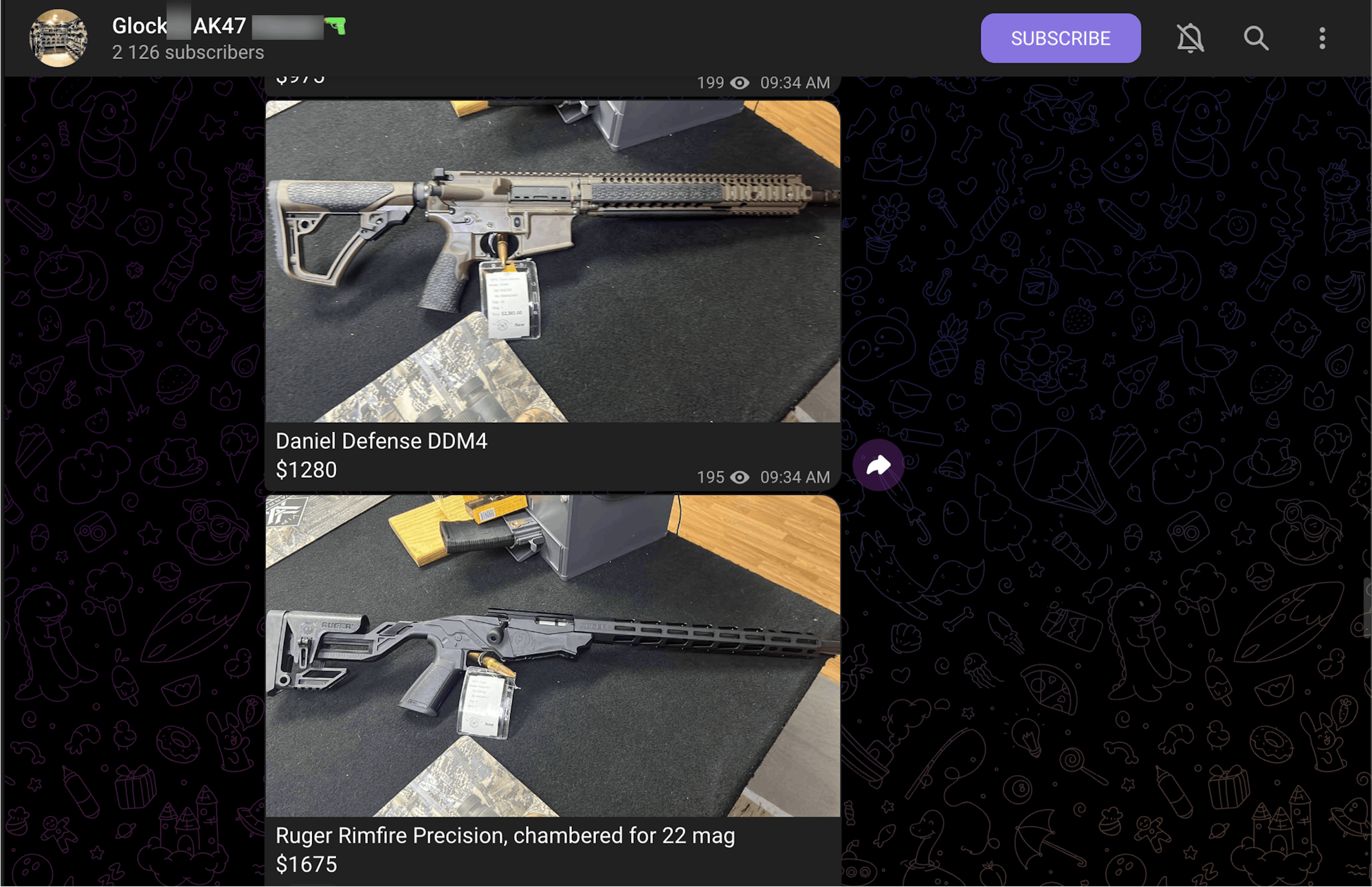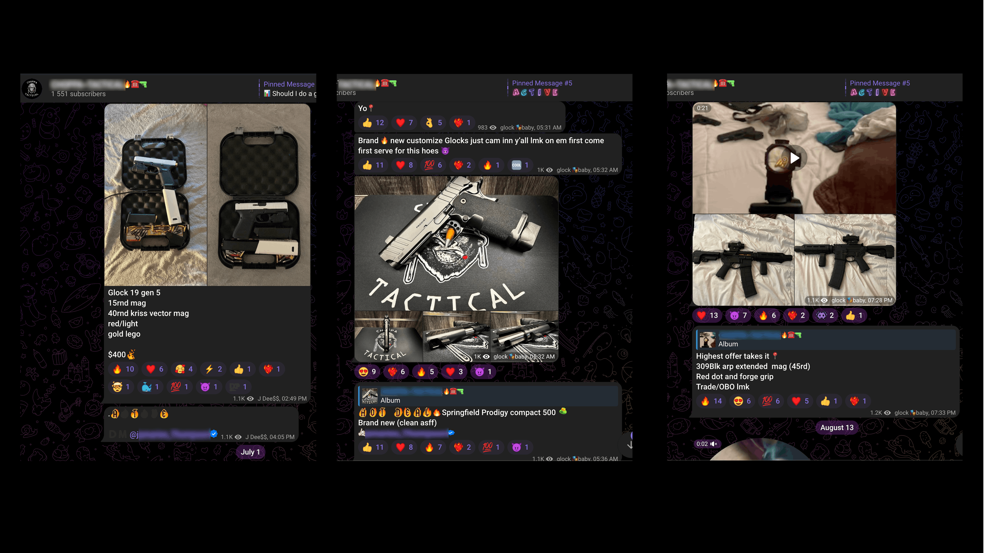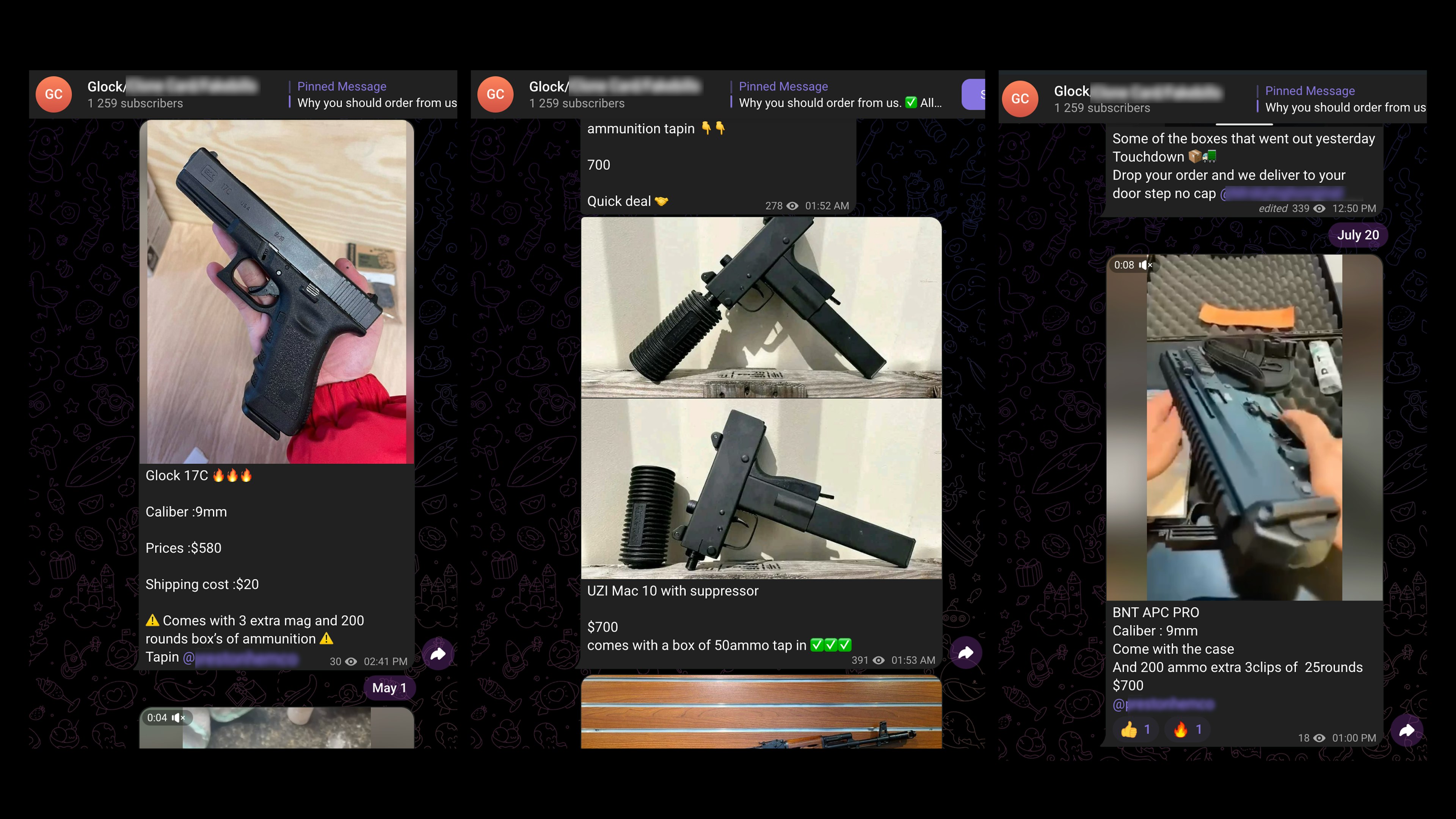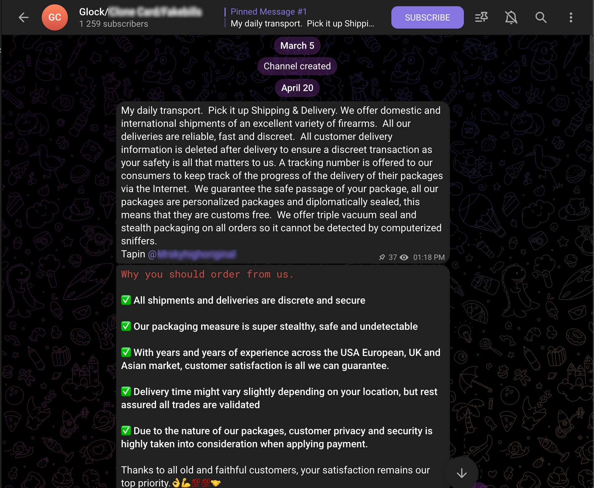The Telegram channel had a pinned post that stated, “We offer domestic and international shipments of an excellent variety of firearms,” and boasted about its “diplomatically sealed” and “stealth” packaging.