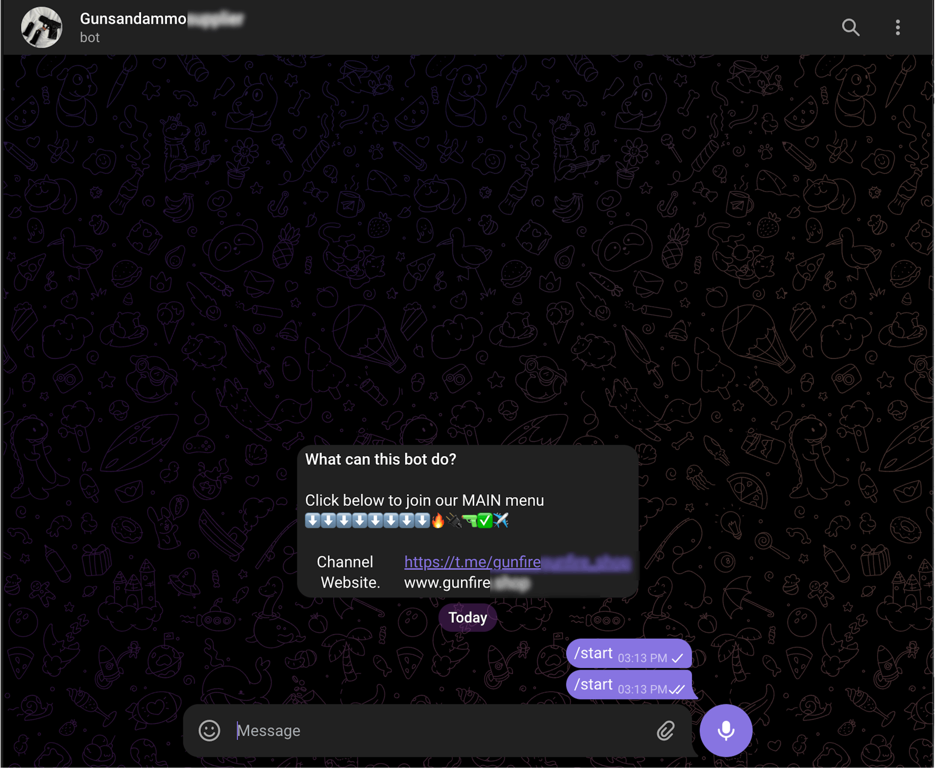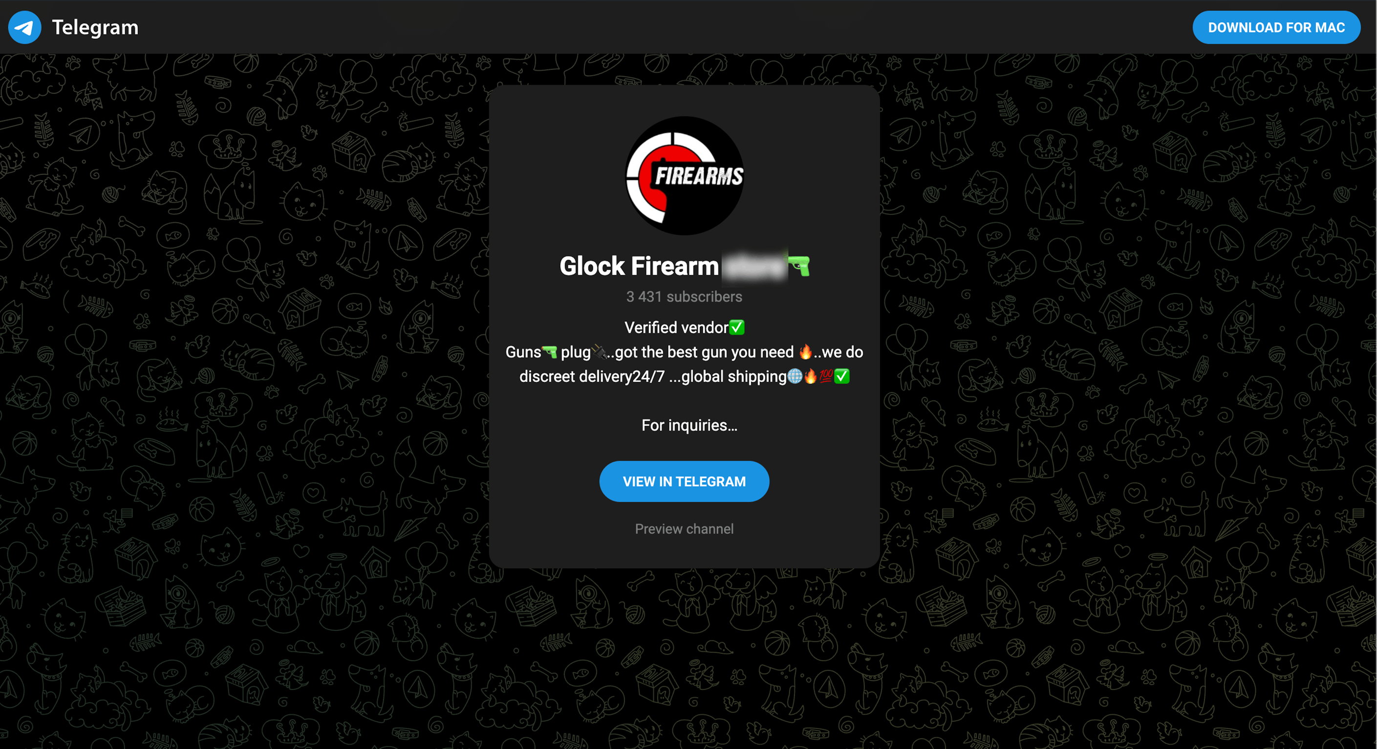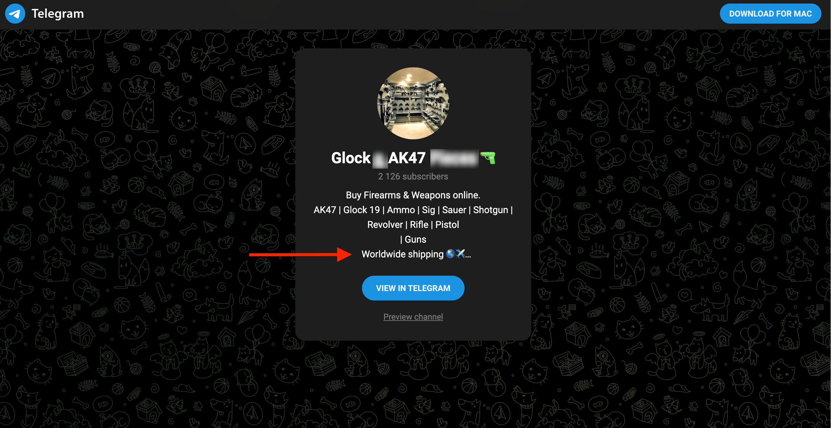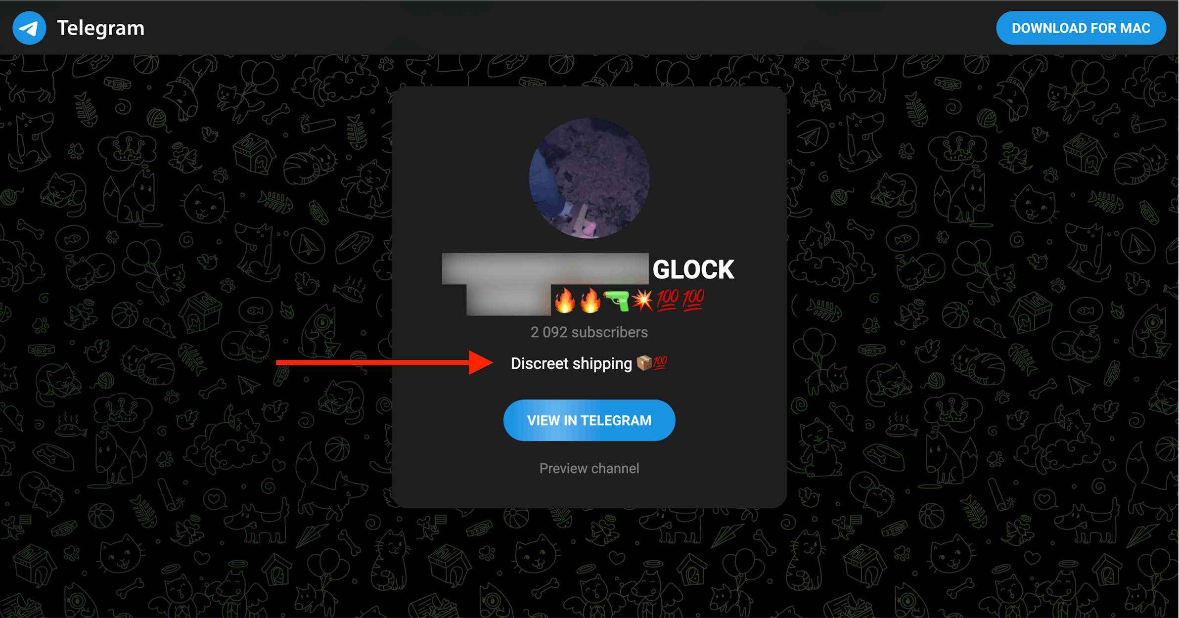 The Telegram channel had a pinned post that stated, “We offer domestic and international shipments of an excellent variety of firearms,” and boasted about its “diplomatically sealed” and “stealth” packaging.