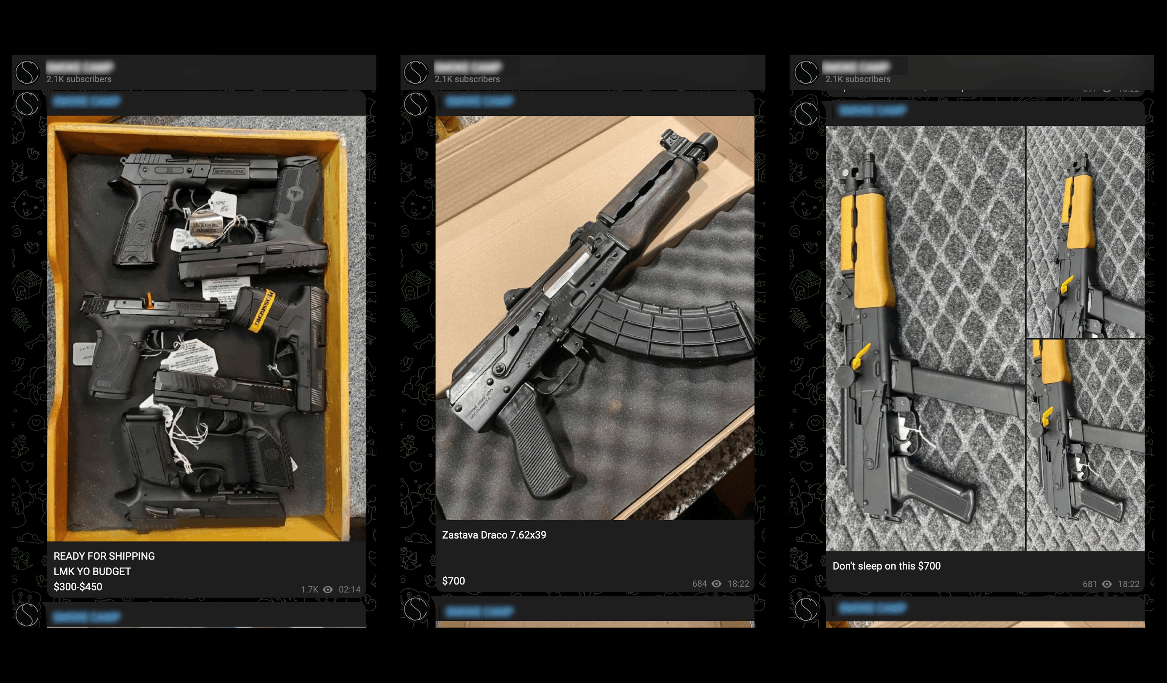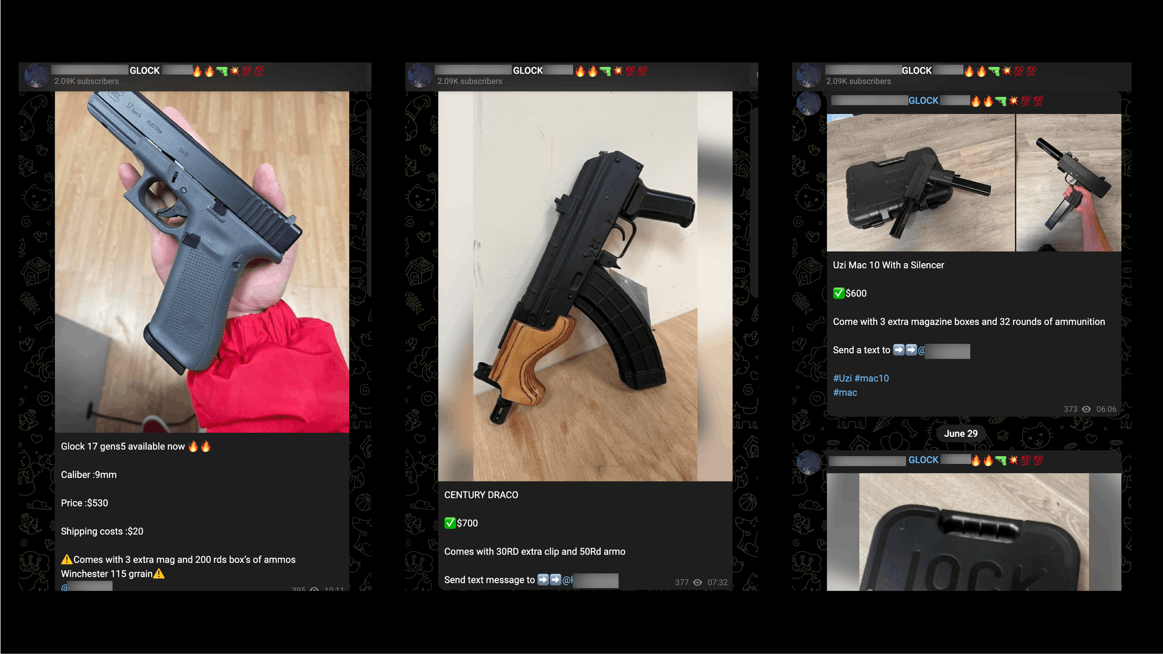 - The ads offered firearms including Glock pistols, assault weapons, or untraceable "ghost guns."
