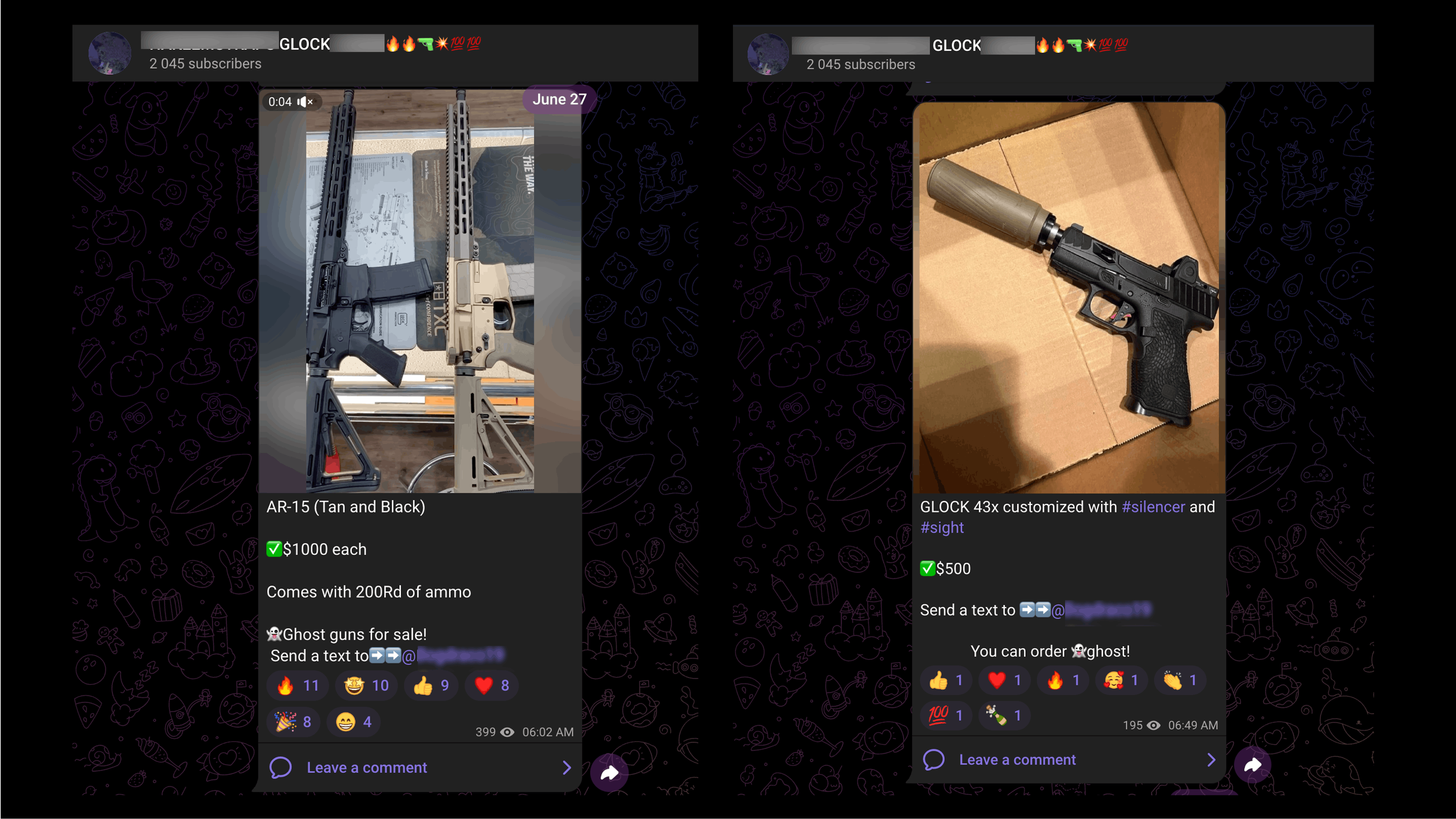 One ad that ran in early October 2023 on Facebook, Instagram, and Messenger, read, “ALL GLOCKS AVAILABLE ON TELEGRAM 🔥🔥” and linked to a Telegram channel that promised “Discreet shipping.” The Telegram account offered a variety of Glocks and other firearms for sale including AR-15 rifles and submachine guns, giving prices for each.
