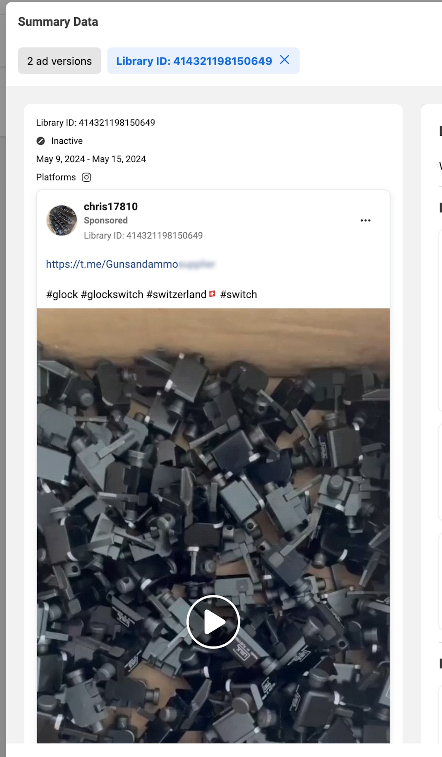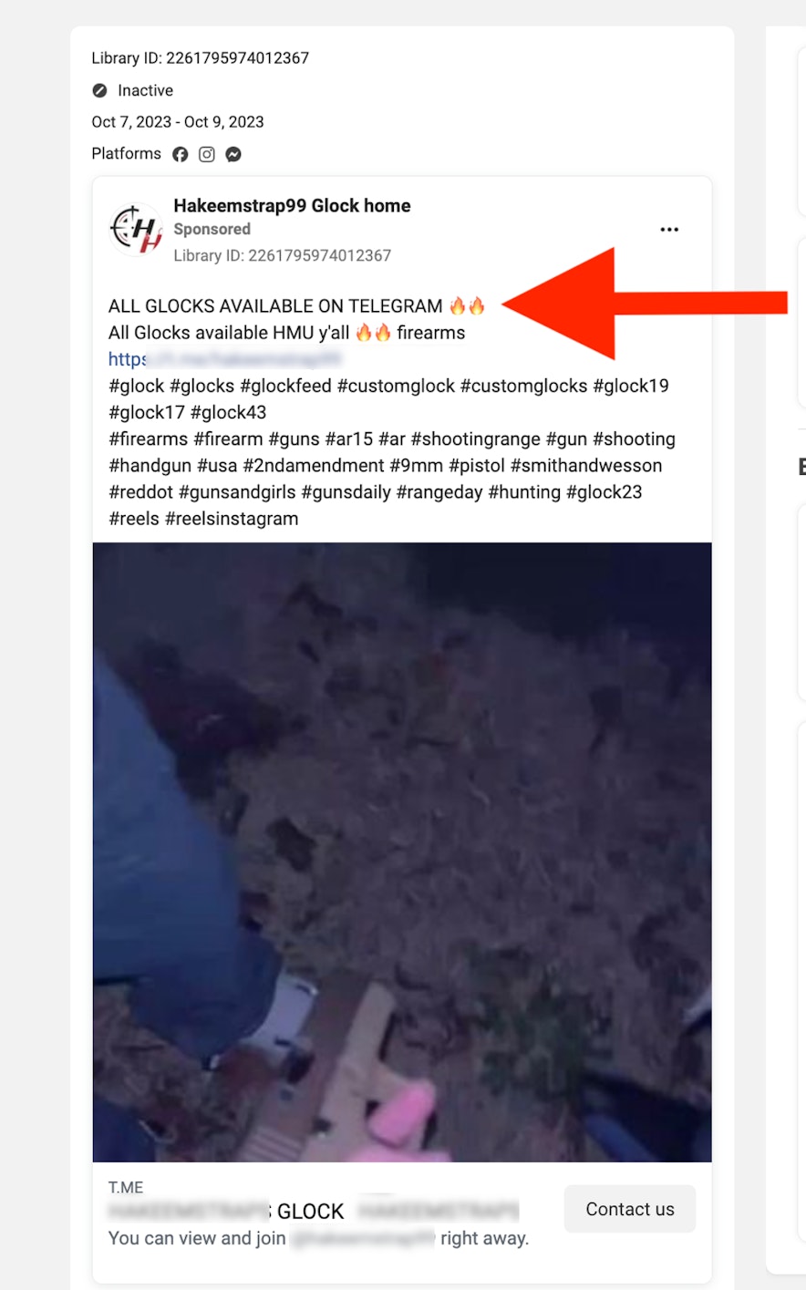 One ad that ran on Facebook, Instagram, and Messenger in October 2023 pointed to a Telegram channel for Glocks.