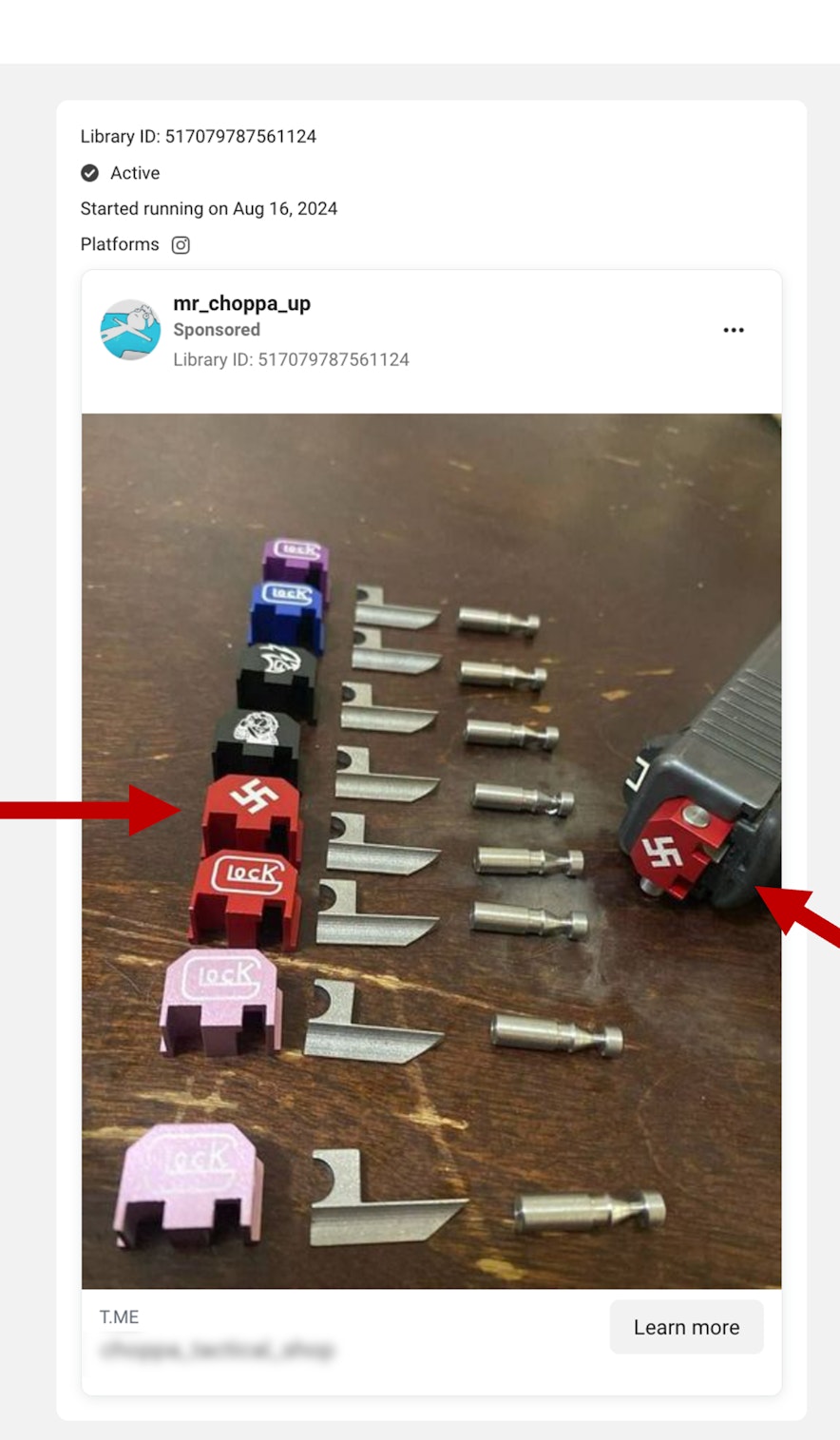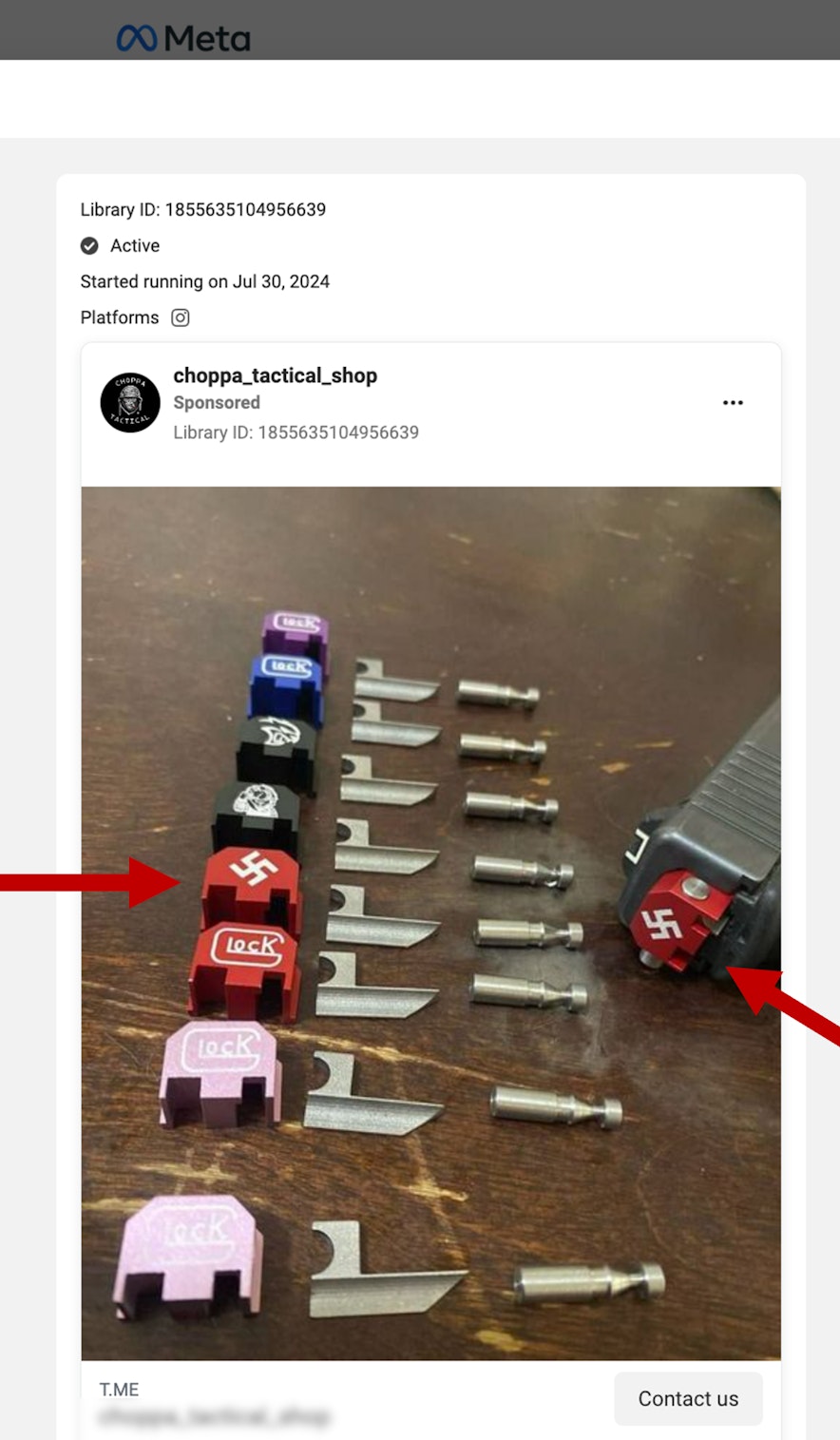 The investigation also identified a pair of ads that mixed hate symbolism with policy-violating gun content. The first ad, which ran on Instagram starting on July 30, 2024, showed a photo of switches lined up on a table, including some emblazoned with a swastika symbol associated with Nazi Germany. The ad linked to a Telegram channel that sold Glocks pre-affixed with switches plus other weapons. About two weeks later, another Instagram ad showed the same photo of Nazi switches and linked to the same Telegram account.