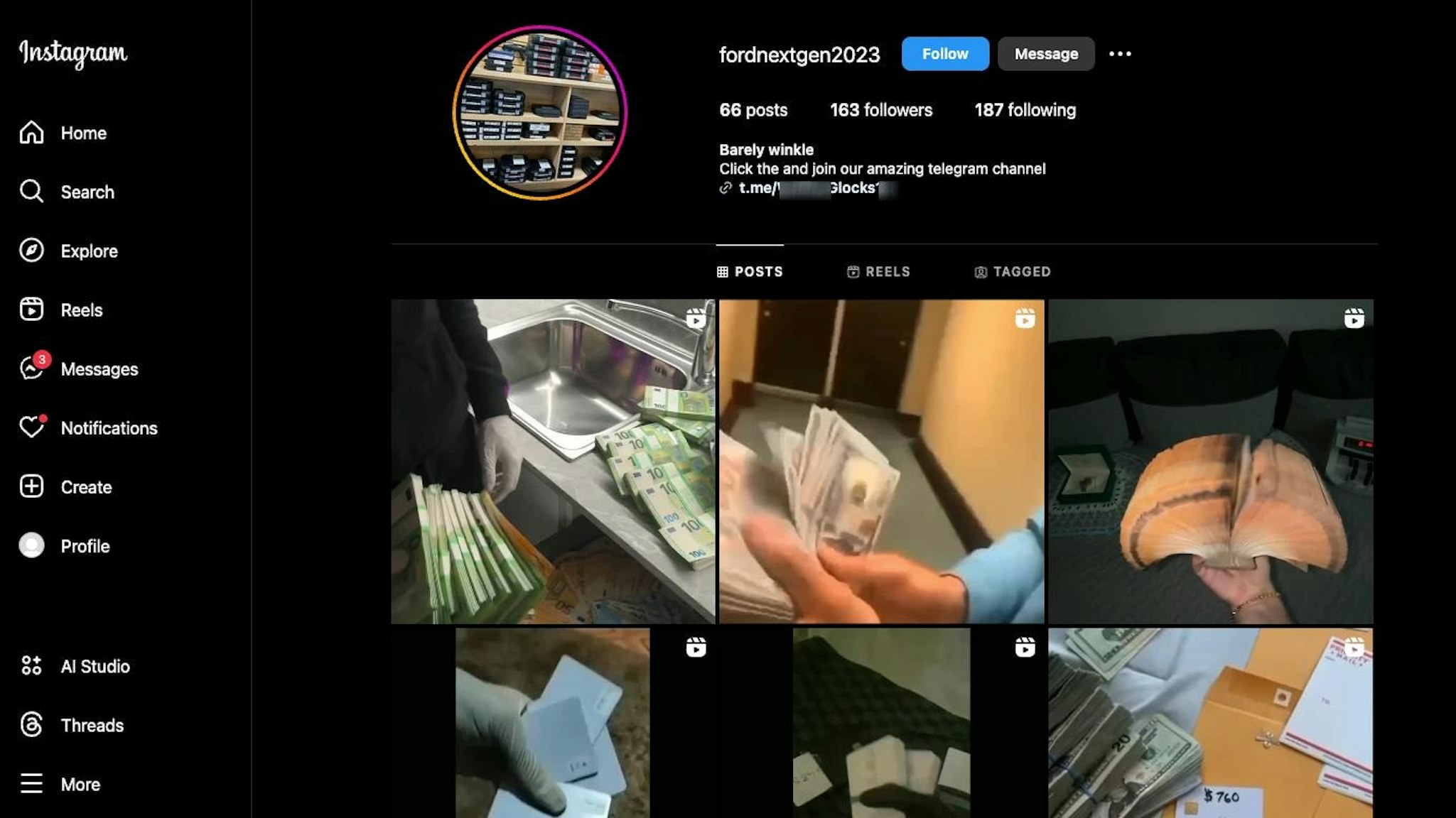 Three Instagram profiles ran ads in June 2024 showing an identical photo of Glock pistols and cases and linking to the same Telegram channel.