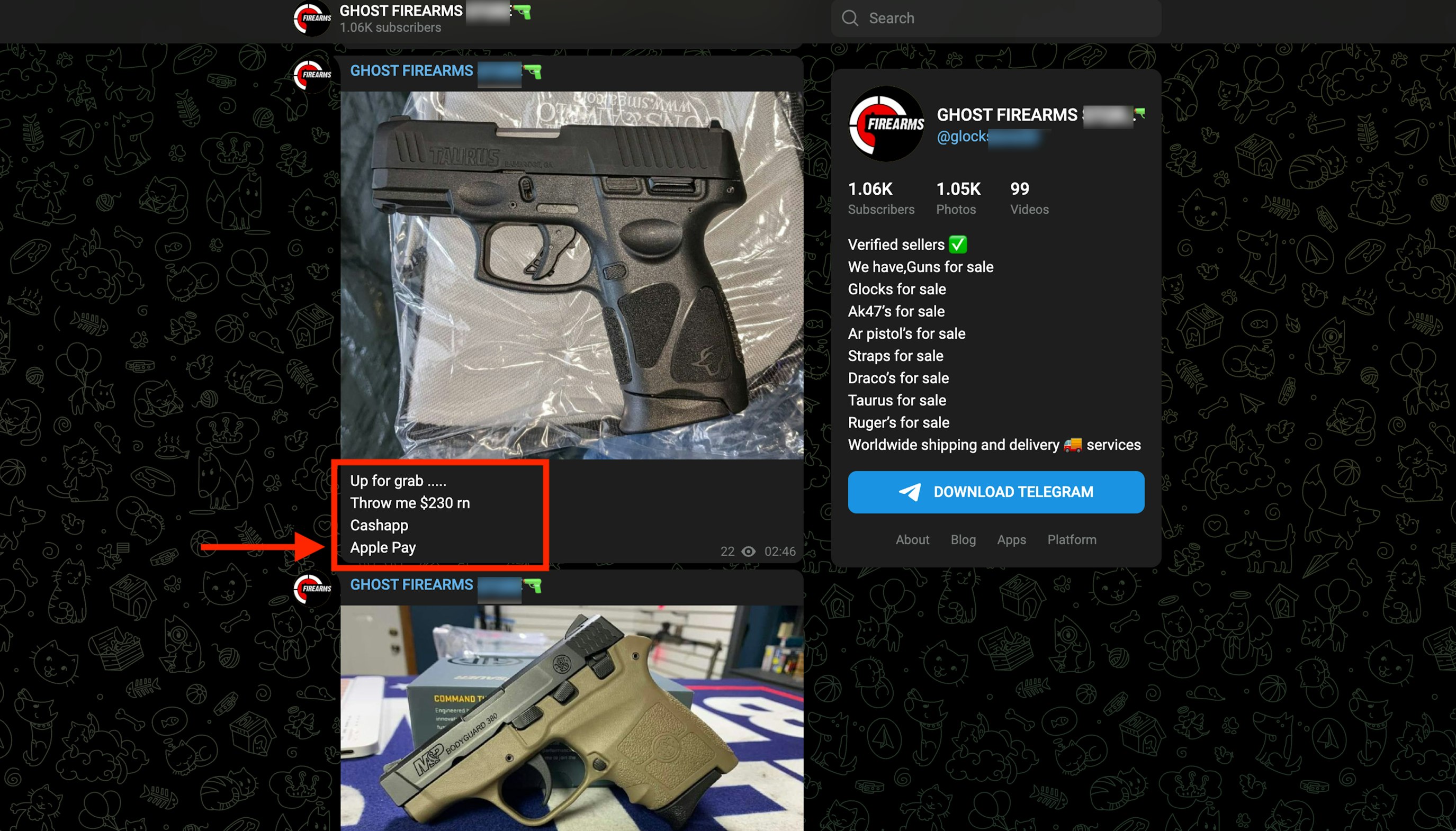 A total of 157 ads identified in this investigation linked to Telegram channels that act as digital storefronts for buyers to purchase a gun.