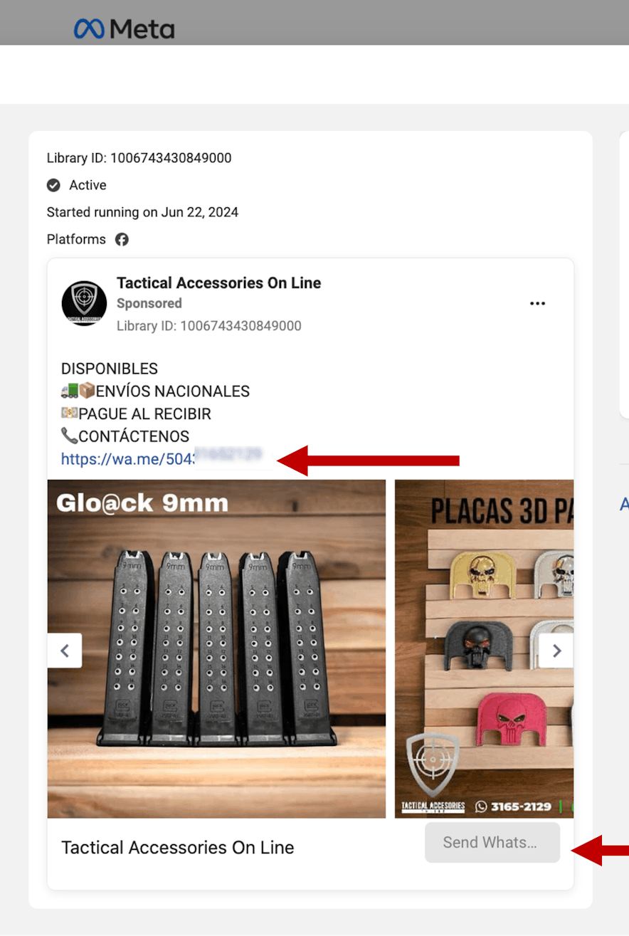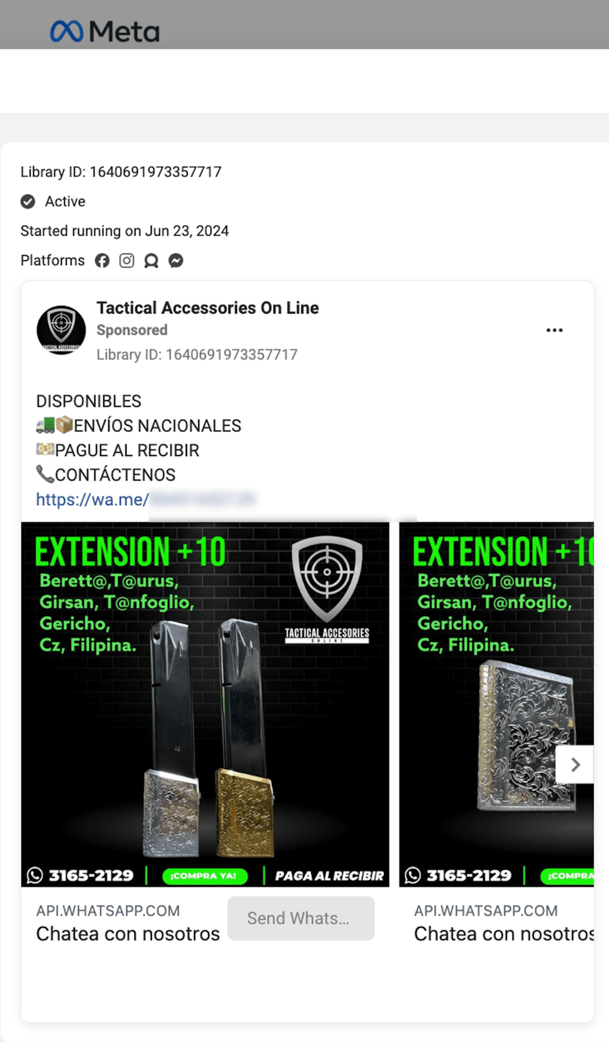 For example, an ad that started running on Facebook on June 22, 2024, with images of ammunition magazines and pistol slide back plates, linked to a WhatsApp business account for “Tactical Accessories On Line.” The account displayed a catalog of gun parts including magazine extensions for Berettas, Glocks, and other firearms.