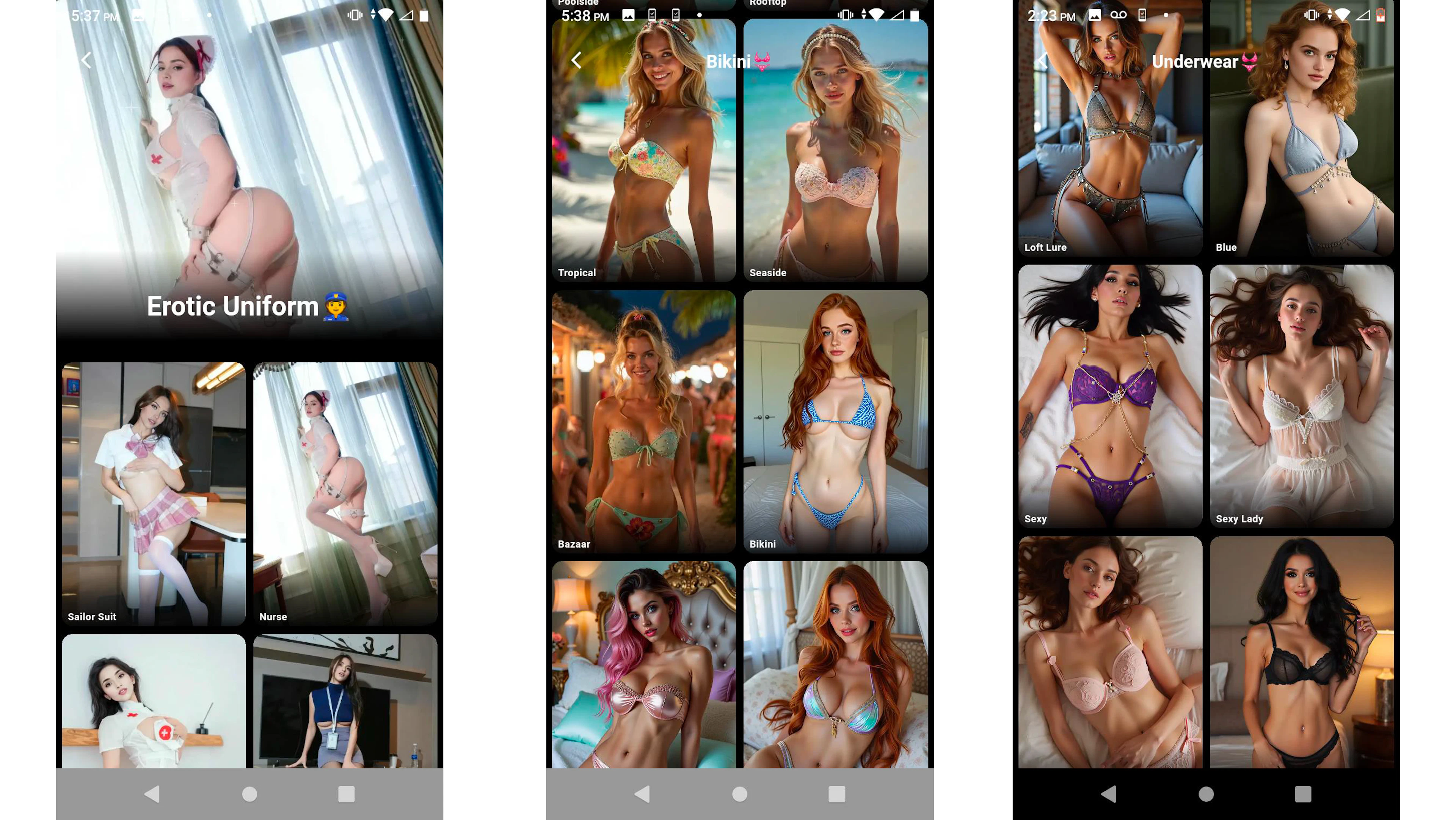 Another sponsored app in the “Suggested For You” carousel was SwapX PRO: AI & Video. The app’s home page is covered in AI video templates of scantily clad women. They are divided into categories like “Erotic Uniform” featuring women in schoolgirl and nurse uniforms, “Bikini,” and “Underwear.”