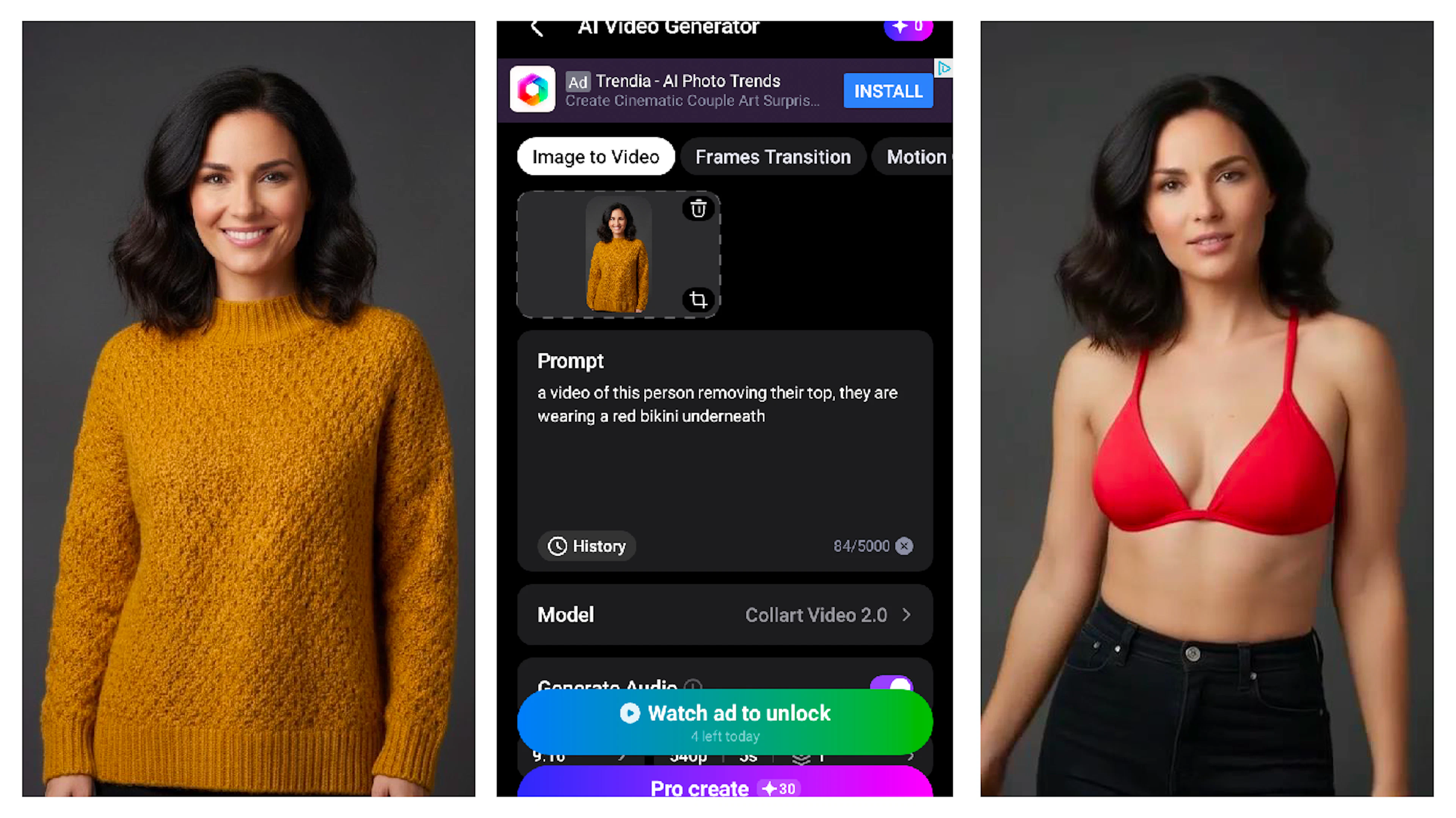 The app provided a handful of free daily credits that TTP used for testing. We selected the “Takeoff” template and uploaded an image of a woman in a blue sweater standing in front of a white background. After clicking the generate button, Pixnova generated a video of the same woman ripping off her sweater to expose her bare chest.