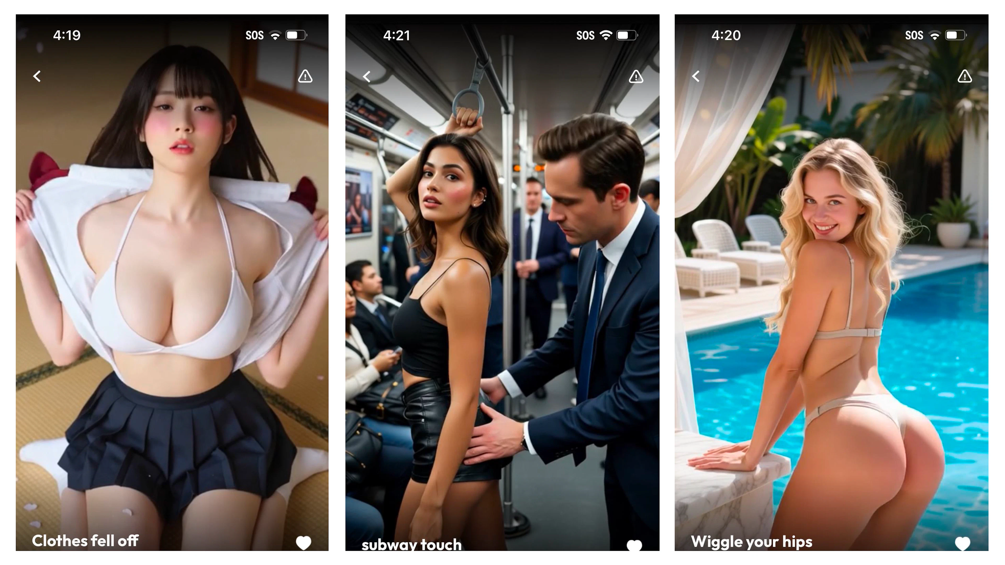 AI Moment, which promises to “instantly transform any photo into a stunning animated video,” did not offer free trials or credits so TTP did not test the features. But the app’s homepage showed a variety of sexual AI video templates with names like “Clothes fell off,” “Wiggle your hips,” and “Subway touch.”