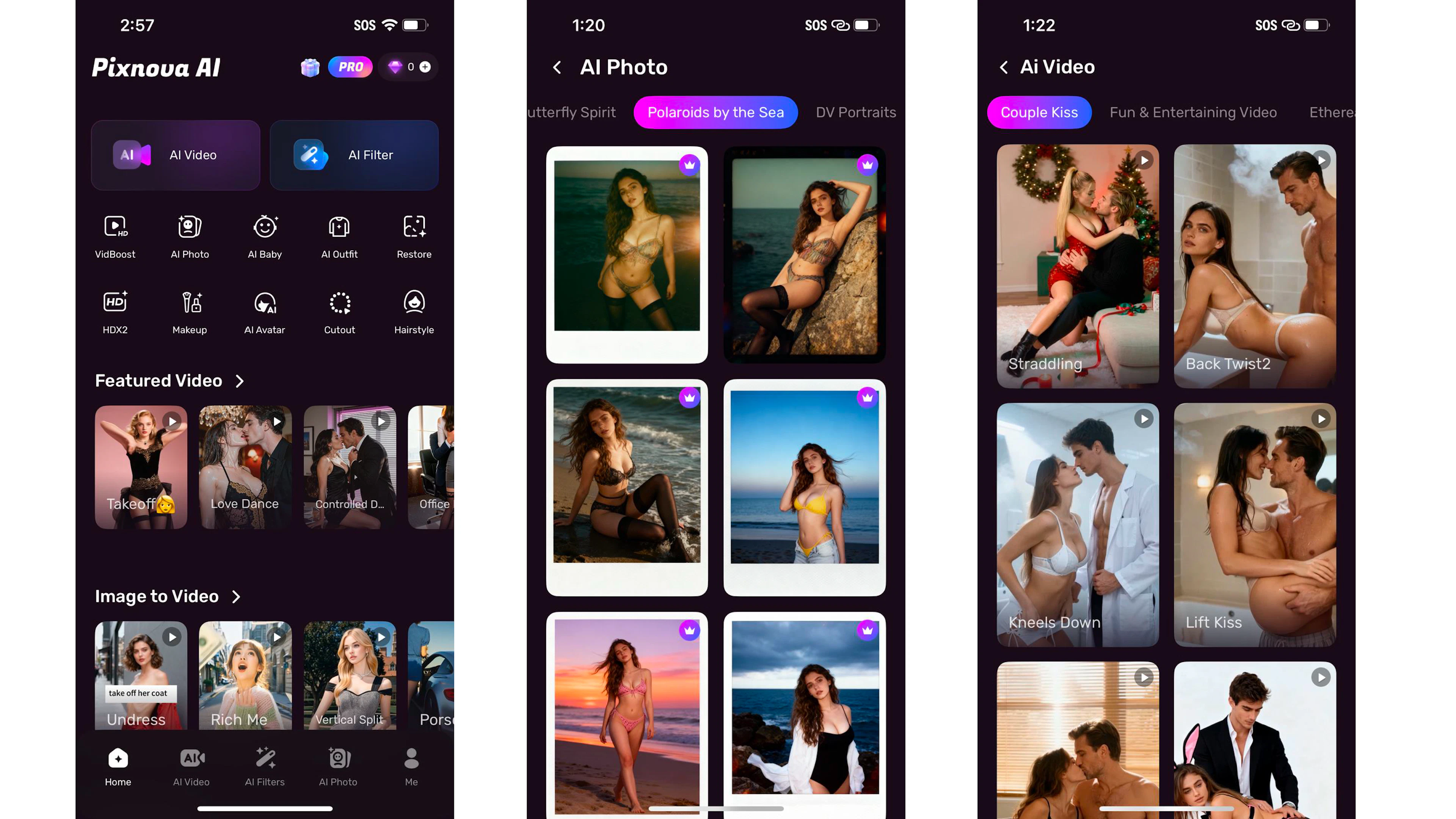 Pixnova boasts “thousands of AI filters” that can transform photos into anime characters, action figures, and Disney-style cartoons. But the home page of the app quickly pointed to other uses. The first AI template called “Takeoff” shows a video of a woman ripping off her black dress. Other templates depict women in various sexual positions, lingerie and bikinis.