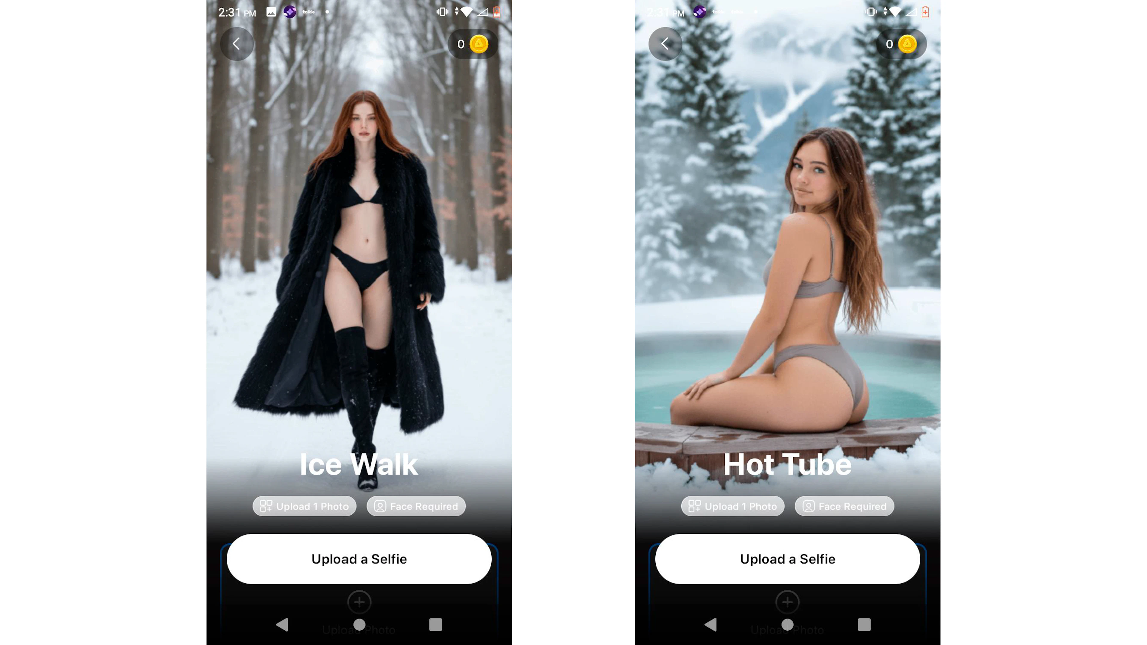 The app featured AI video templates of women in minimal clothing, including a bikini-clad woman perched on the edge of a hot tub and a woman strutting toward the camera with lingerie showing through her fur coat. The app did not offer free features for TTP to test, but it did give instructions on the best way to upload photos for AI editing.