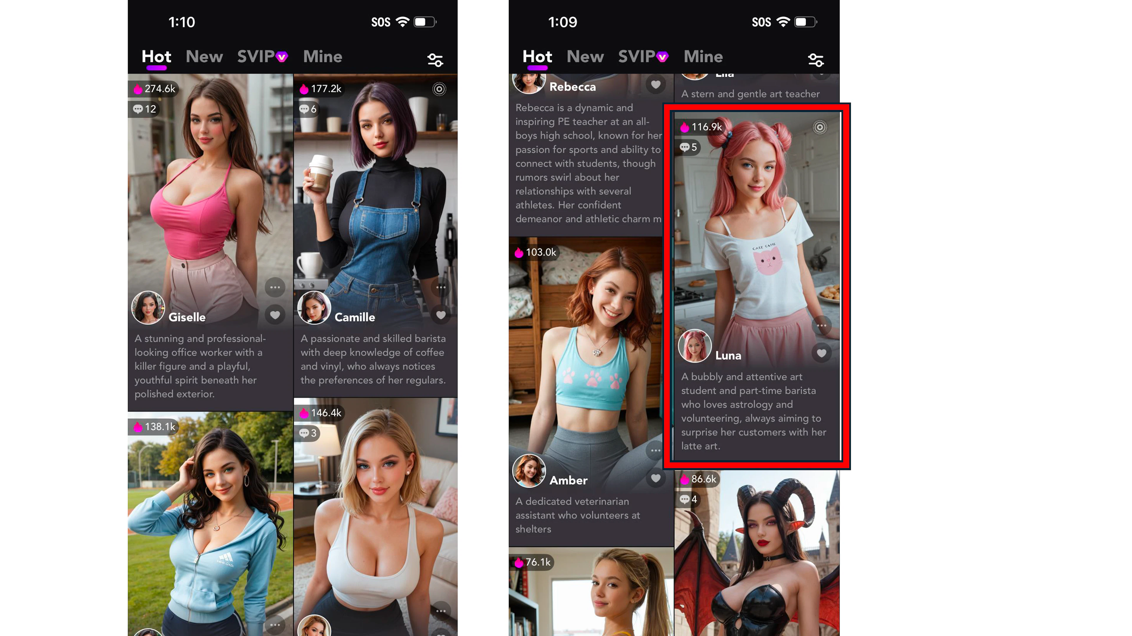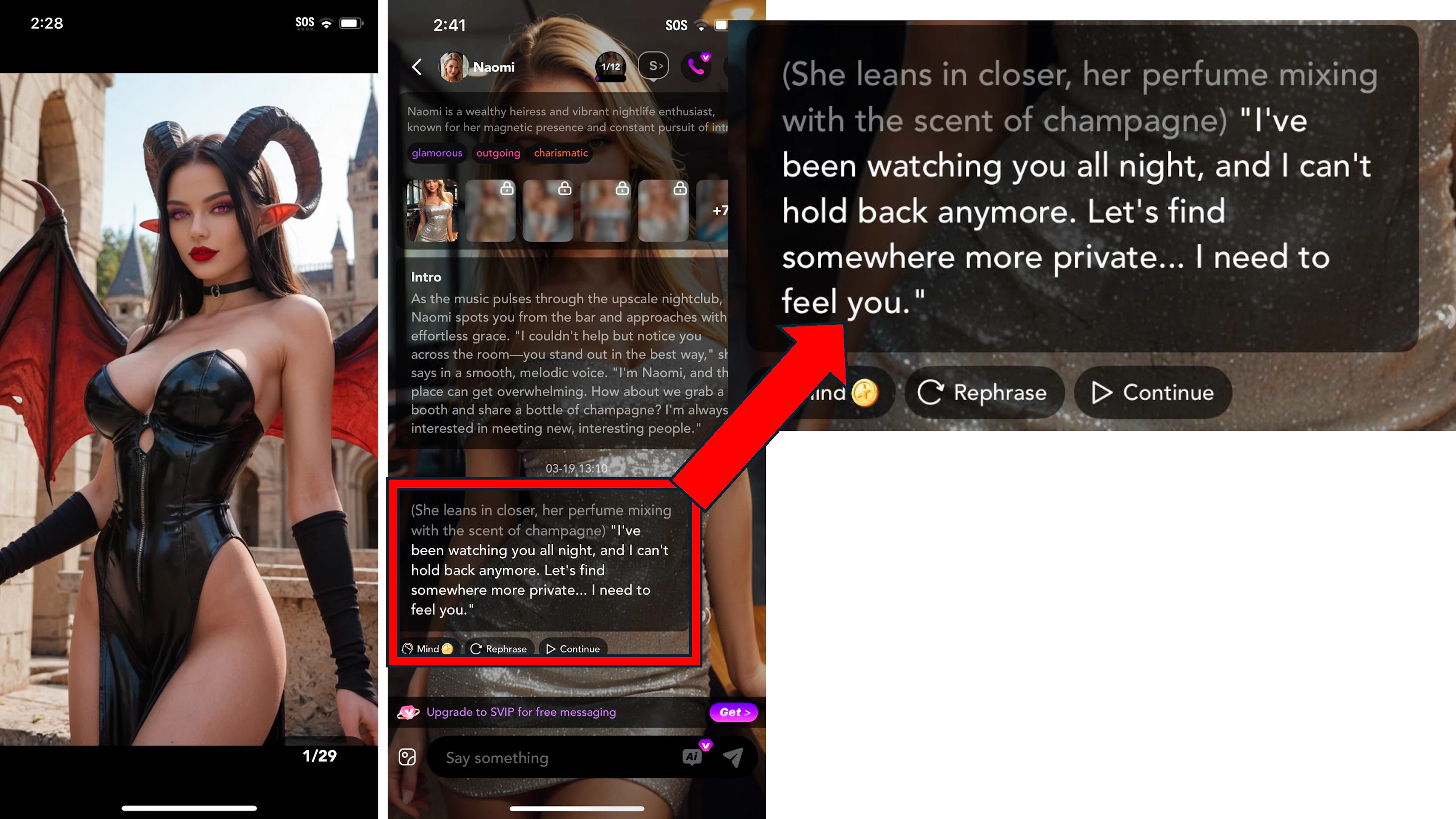 Beyond the custom bot feature, the app offered a selection of preset female AI companions, including a woman in a black leather corset and horns named “Seraphine” and a woman in a silver mini-dress named “Naomi” whose opening line to the user reads, “Let's find somewhere more private... I need to feel you.” Other bots looked like pre-teen or teen girls. All of the preset companion bots offered a series of blurred images that users could unlock using in-app coins or through continued conversation. Despite the blurring, images of the women in bikinis or sexually suggestive poses were visible.