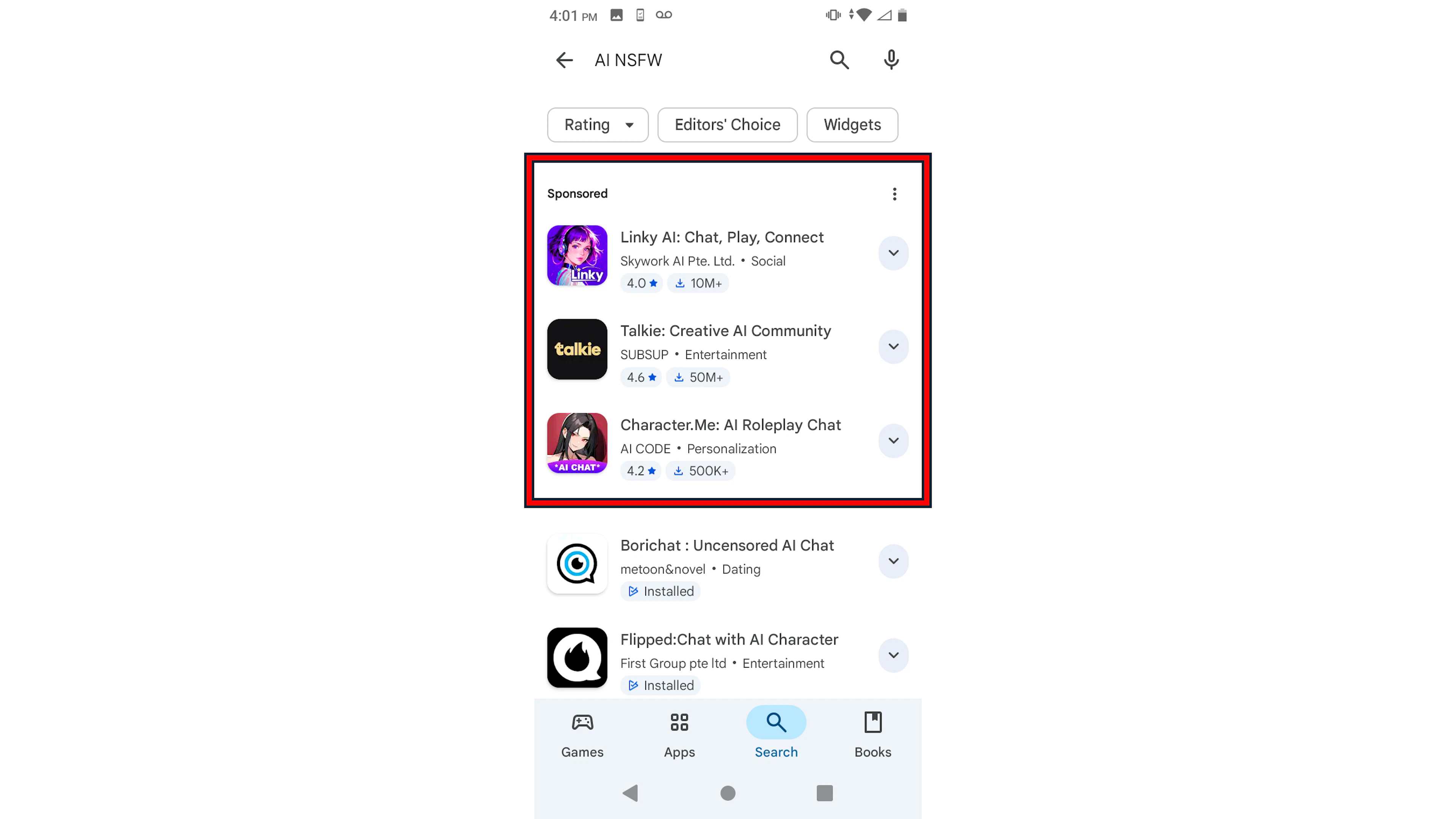 Google Play shows ads based on advertiser keywords, and they can appear beside, above, or below search results. Google says ad content on its platforms cannot show images or videos of “graphic sexual acts intended to arouse,” content promoting nonconsensual sexual themes “whether simulated or real,” or synthetic content “that has been altered or generated to be sexually explicit or contain nudity.”
