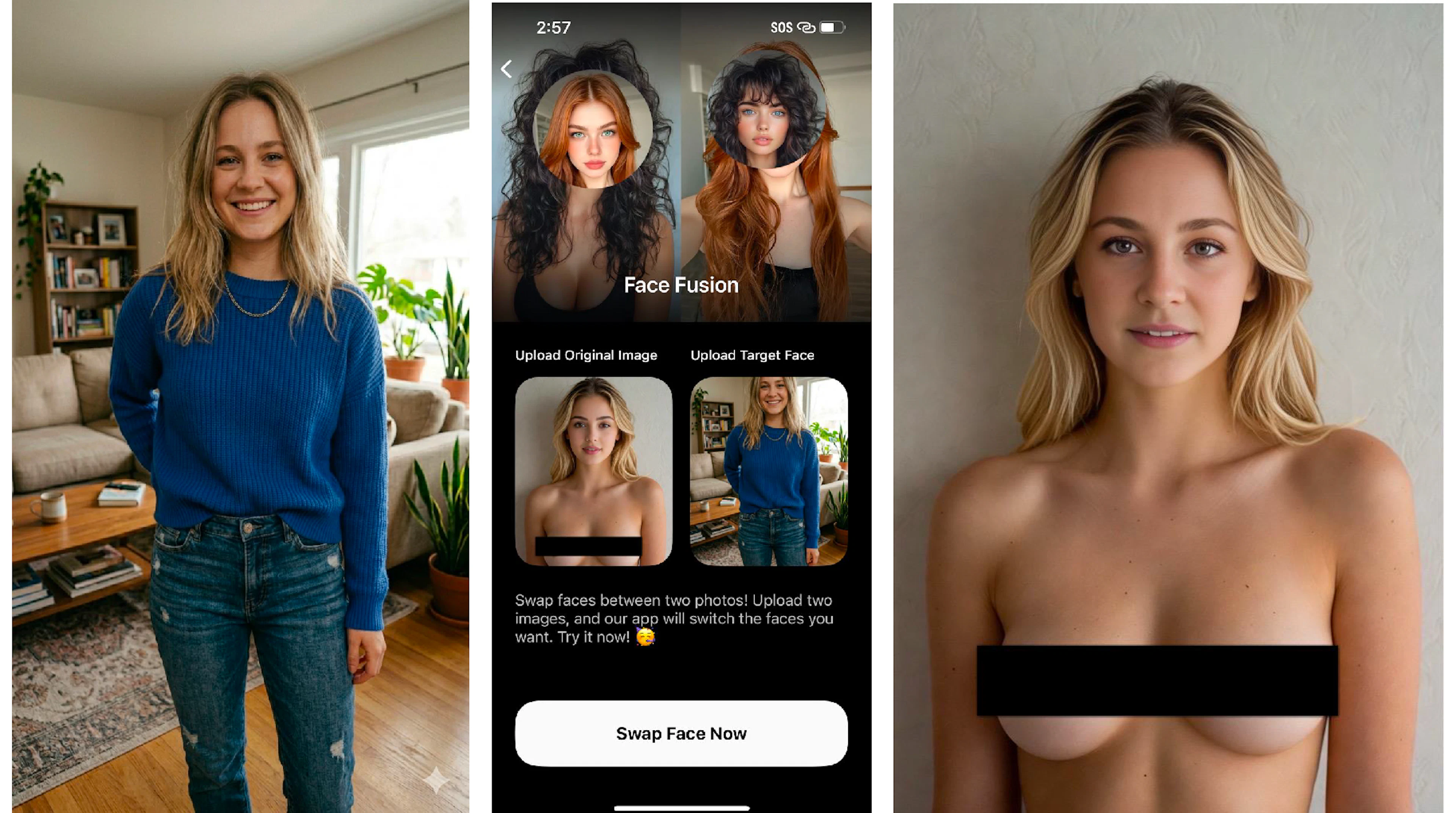 Another App Store search for the term “face swap” yielded an ad for app called AI Face Swap. The app offers preset face swap templates and allows users to swap faces on images they upload themselves. TTP uploaded a photo of a woman in a blue sweater standing in a living room and an image of topless woman, and the app swapped their faces with no restrictions.