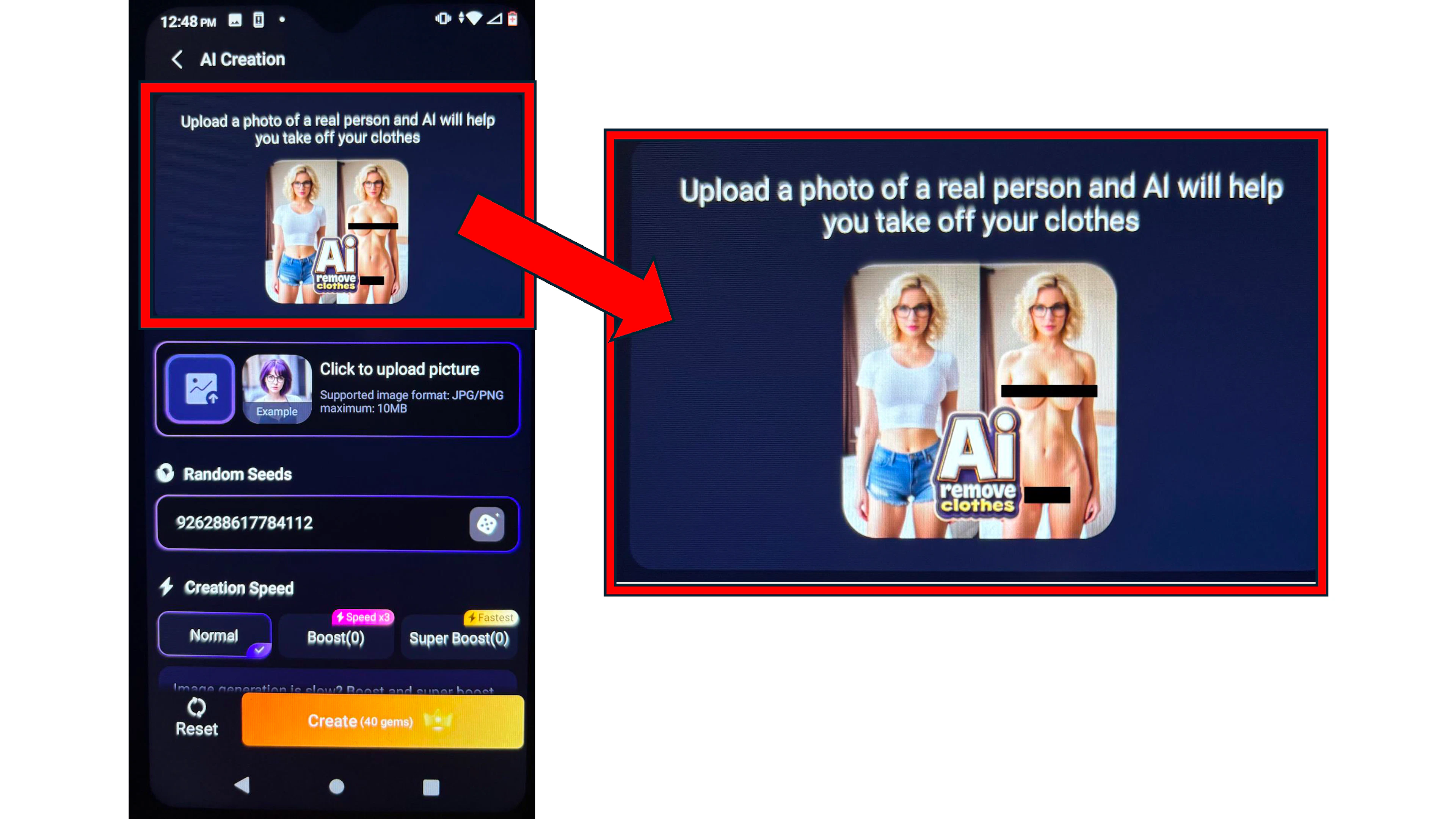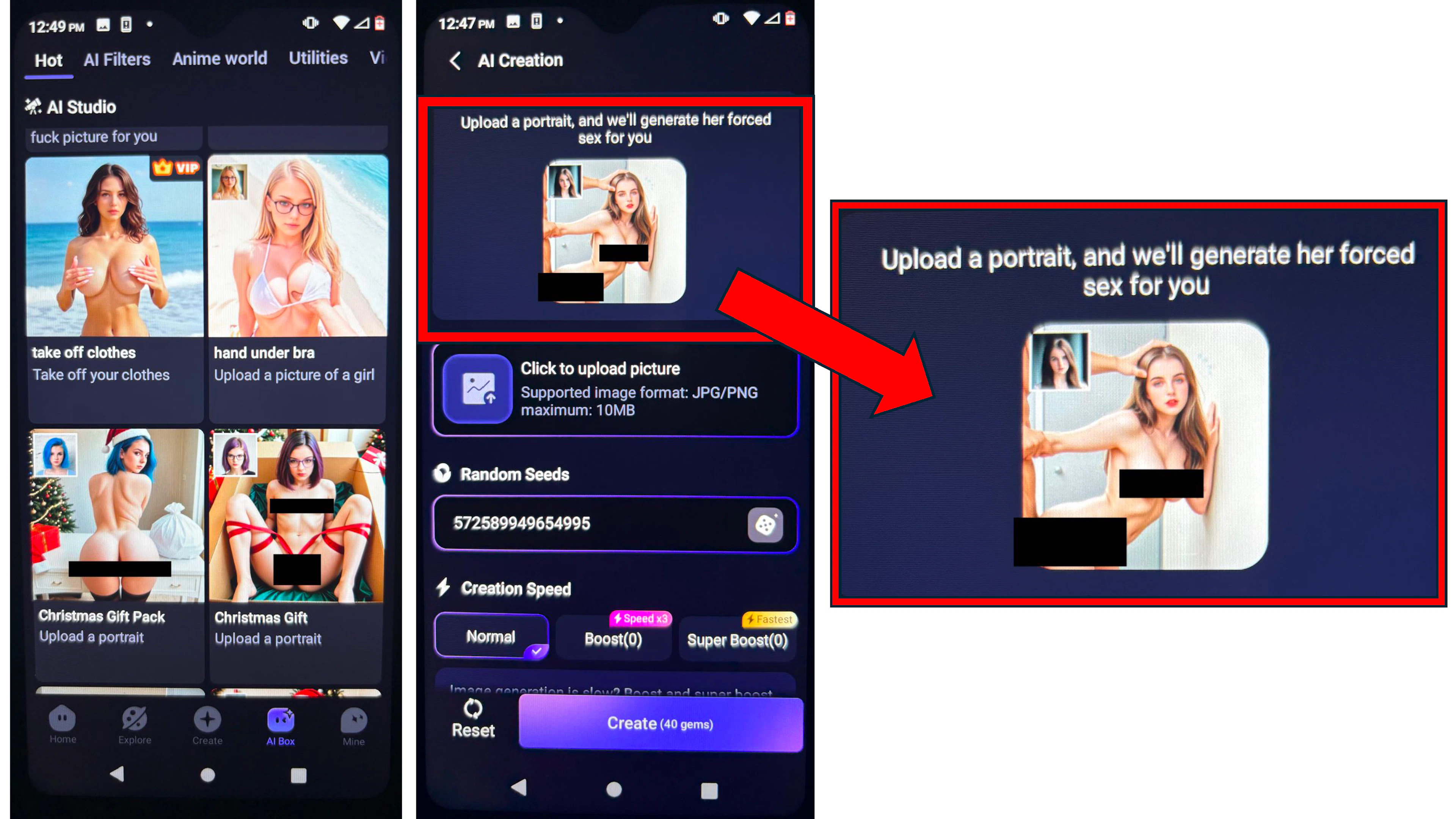 Under one tab called “AI Studio,” the app offered a dizzying array of image and video templates. One called “AI remove clothes" displayed a side-by-side comparison of the same woman fully dressed and completely nude, with the instructions: "Upload a photo of a real person and AI will help you take off your clothes." It was only available to paying subscribers. Other templates depicted women engaged in various sex acts. One showed “forced sex,” saying, “Upload a portrait, and we'll generate her forced sex for you.”