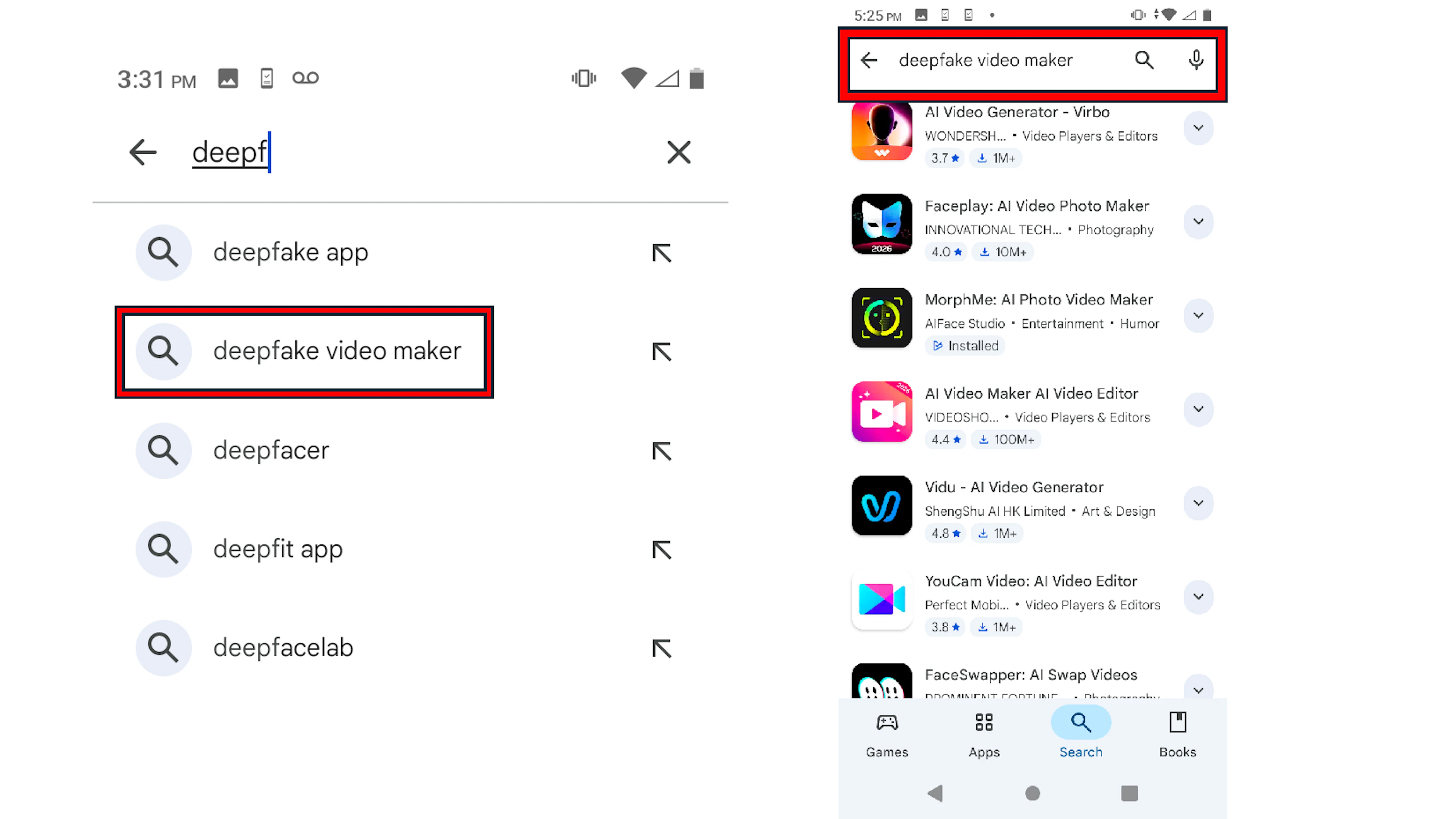 In another case, when TTP started typing “deepfake” into the Google Play search box, it generated the suggestion “deepfake video maker.” The top ten results for that search included Vidu – AI Video Maker.