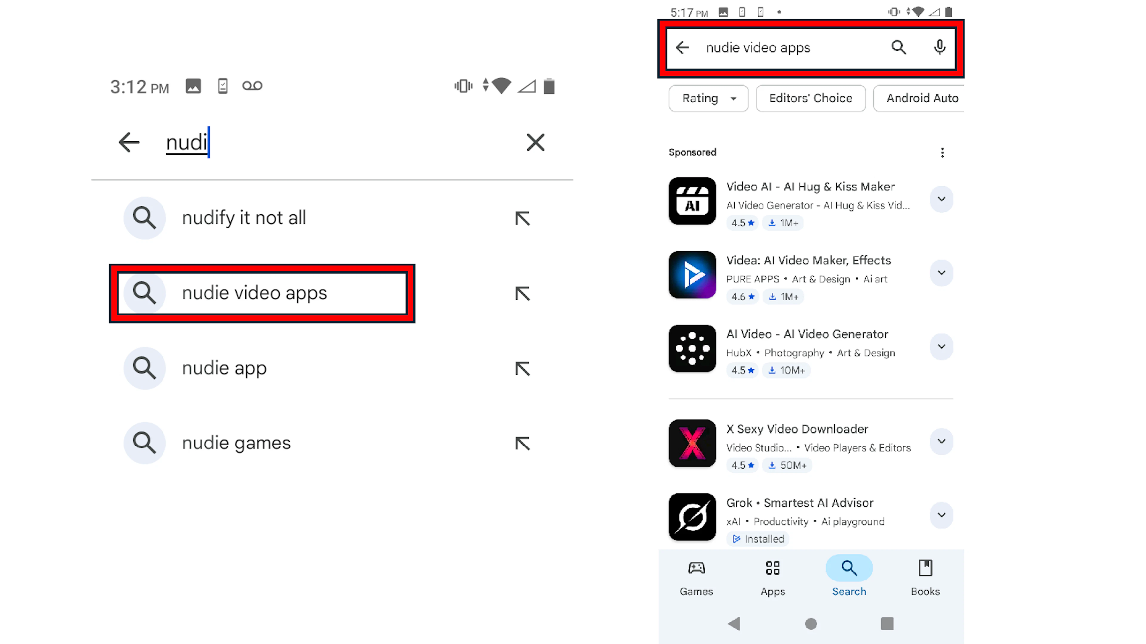 When TTP began typing “nudify” into the Google Play search box, it suggested the search term “nudie video apps.”