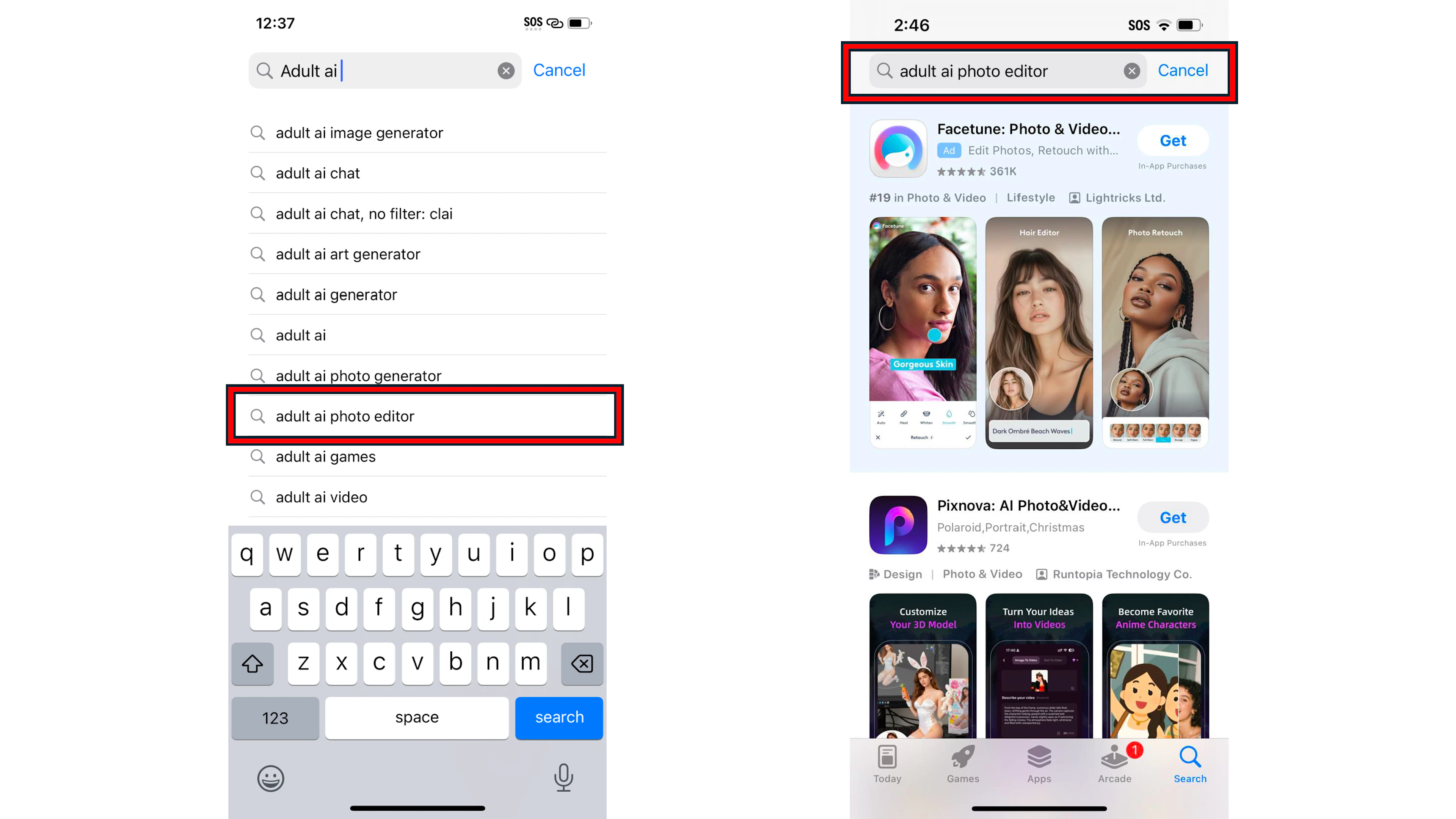 When TTP searched for “adult AI,” the App Store recommended the alternative search “adult ai photo editor.” When TTP clicked on the search term, the app Pixnova: AI Photo&Video Maker was the first result.