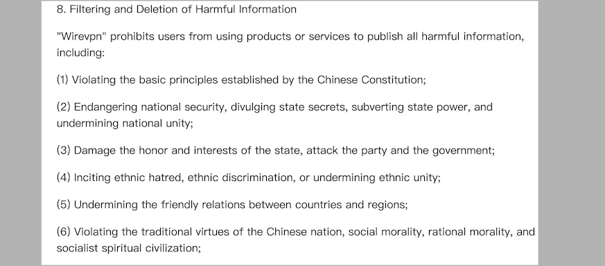 The privacy policy of two Wire VPN apps appeared to copy Chinese government regulations on "harmful information."
