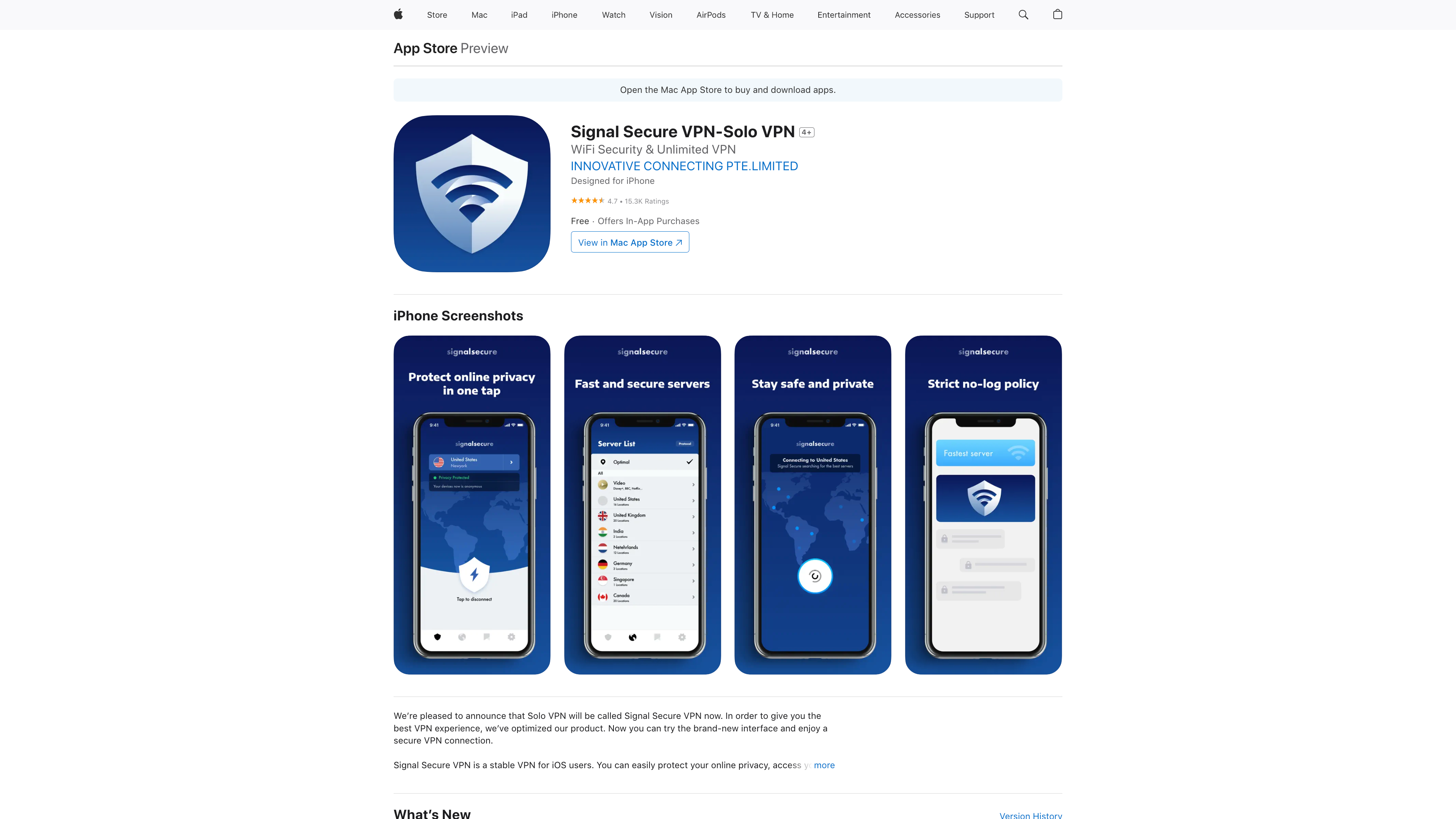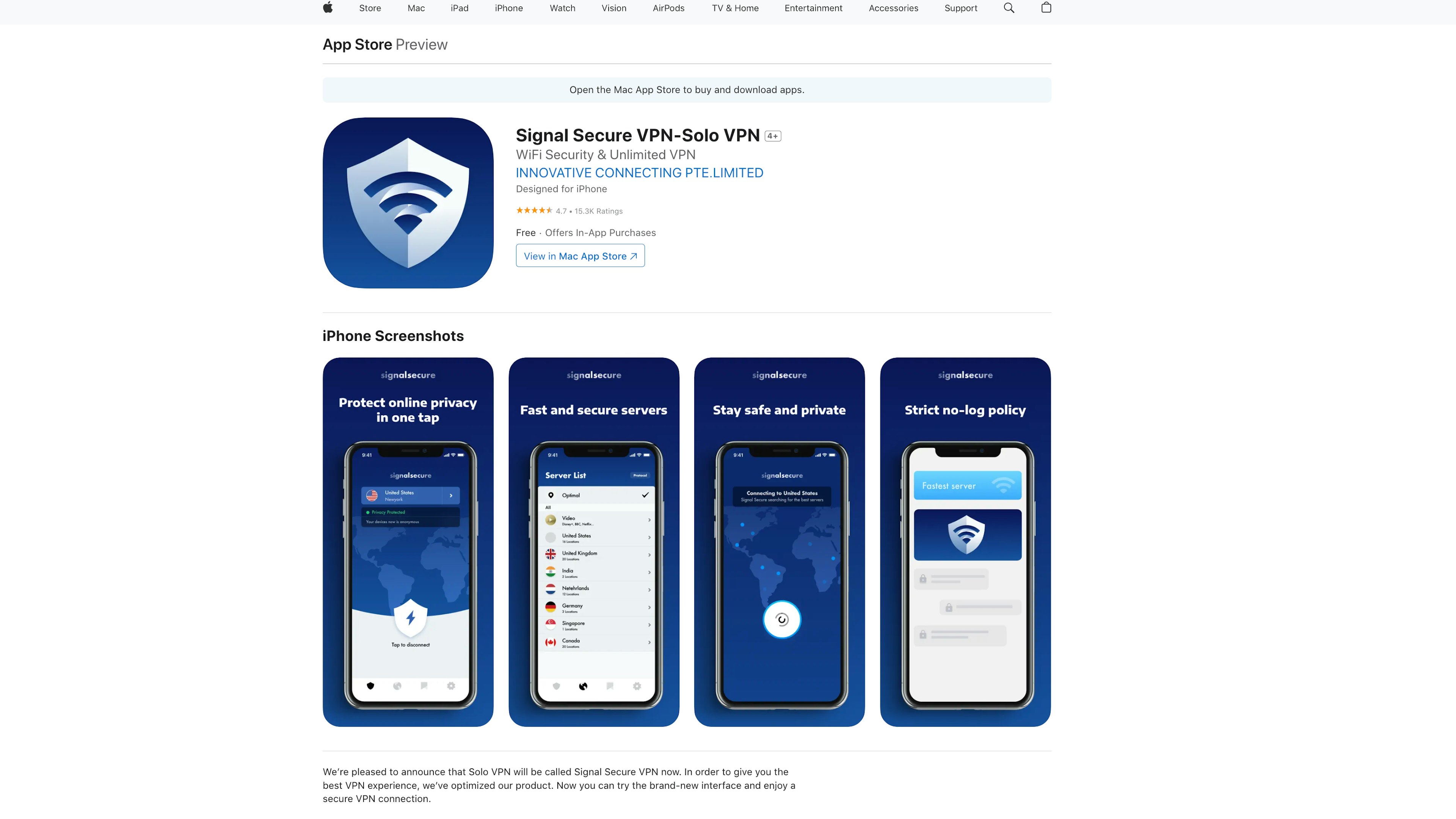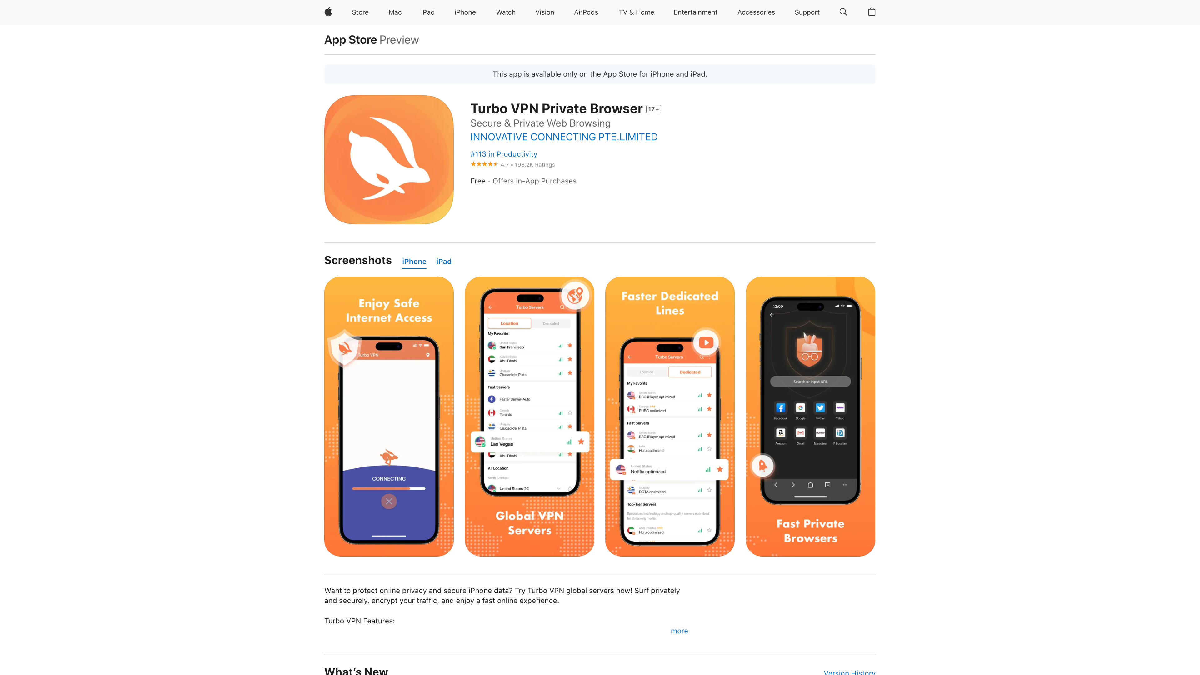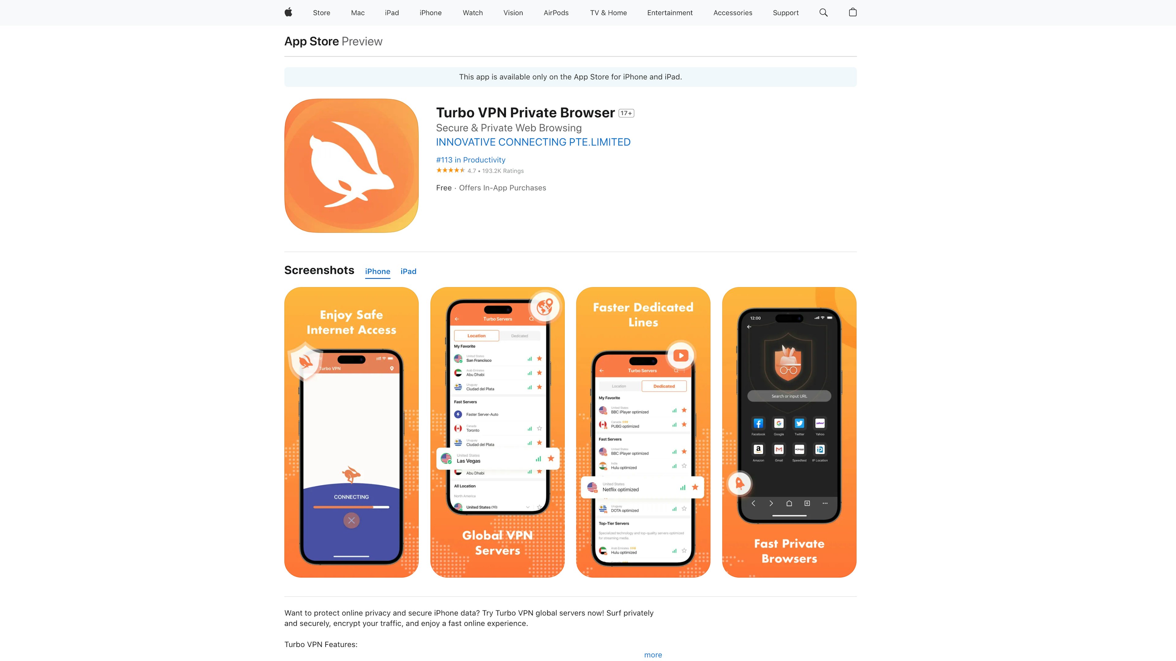 TTP started with an app called Turbo VPN, which ranked 13th in the top 100 free VPN offerings in the Apple App Store last year. The app’s developer is listed as Innovative Connecting Pte. Ltd. (This company is also the developer of a free VPN app called Signal Secure VPN that is not in the top 100.)