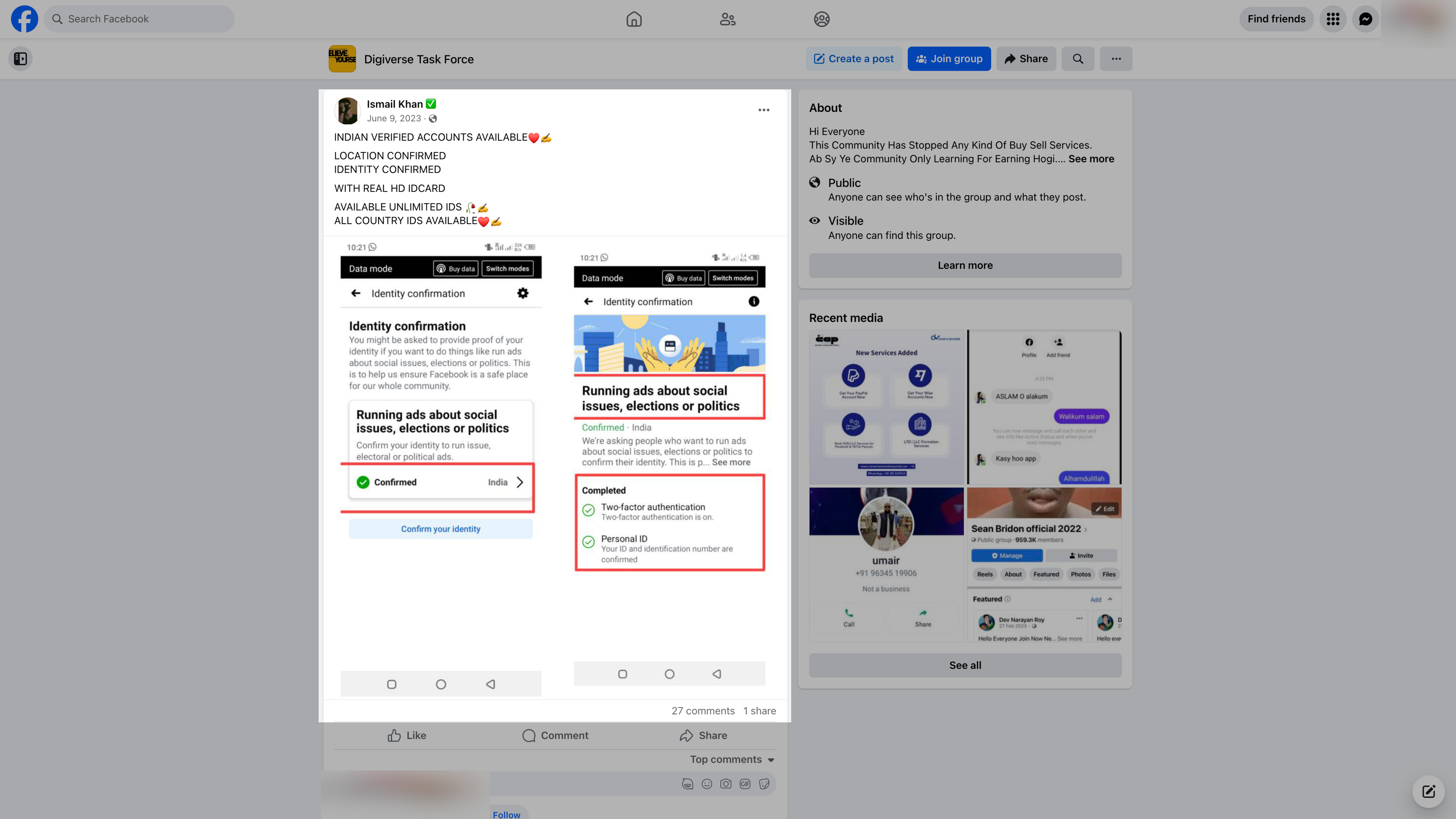 In June 2023, one seller posted in a Facebook group about “INDIAN VERIFIED ACCOUNTS AVAILABLE,” along with screenshots showing Facebook accounts that are authorized to run ads about “social issues, elections, or politics.” The post said the accounts come with an ID card, presumably the one used to verify them.