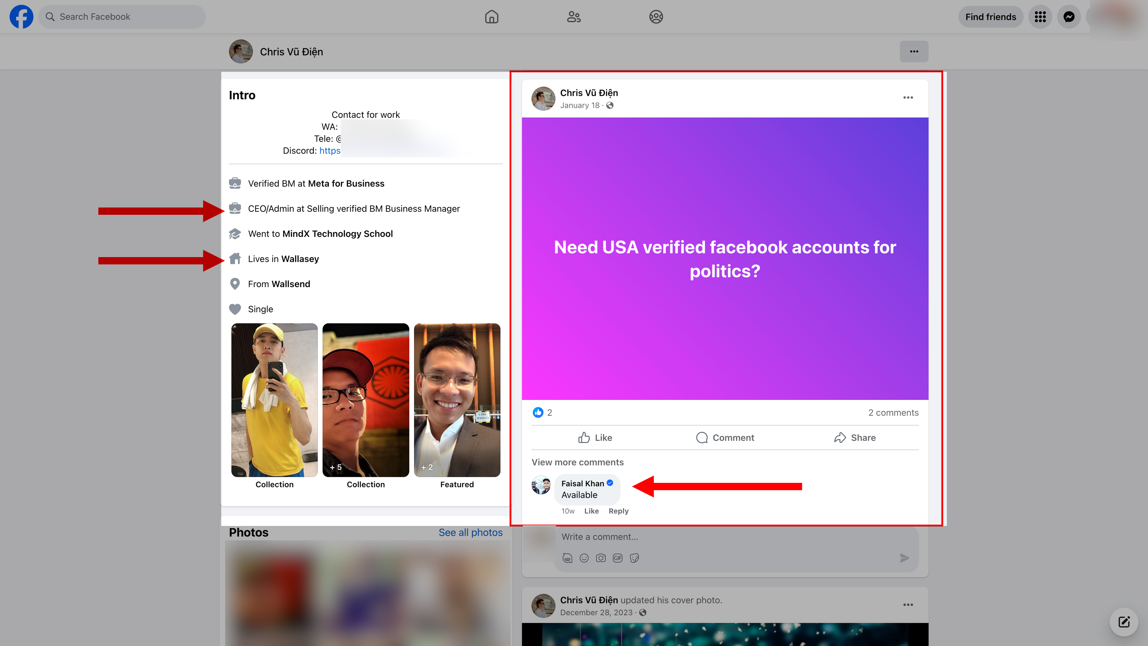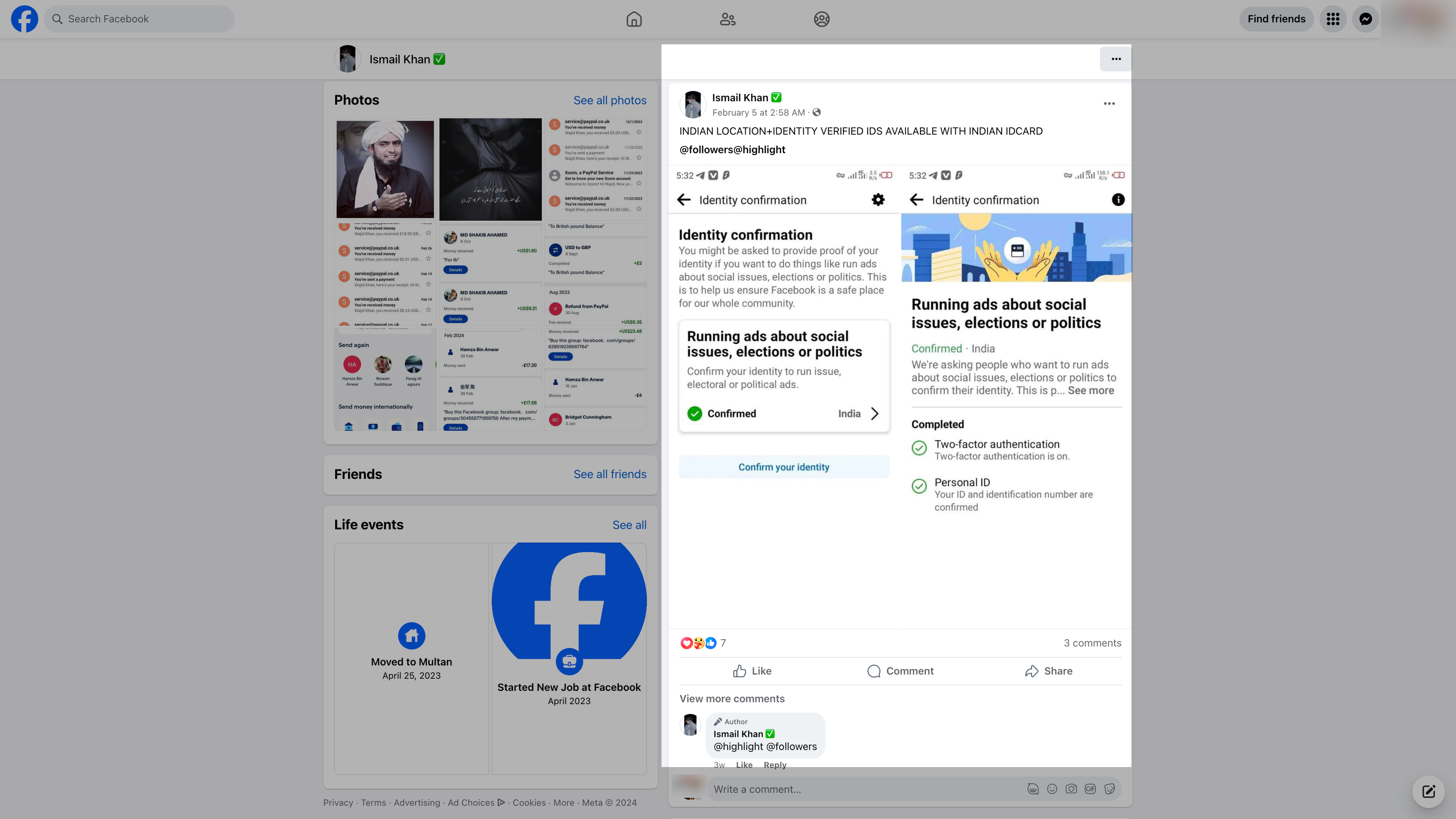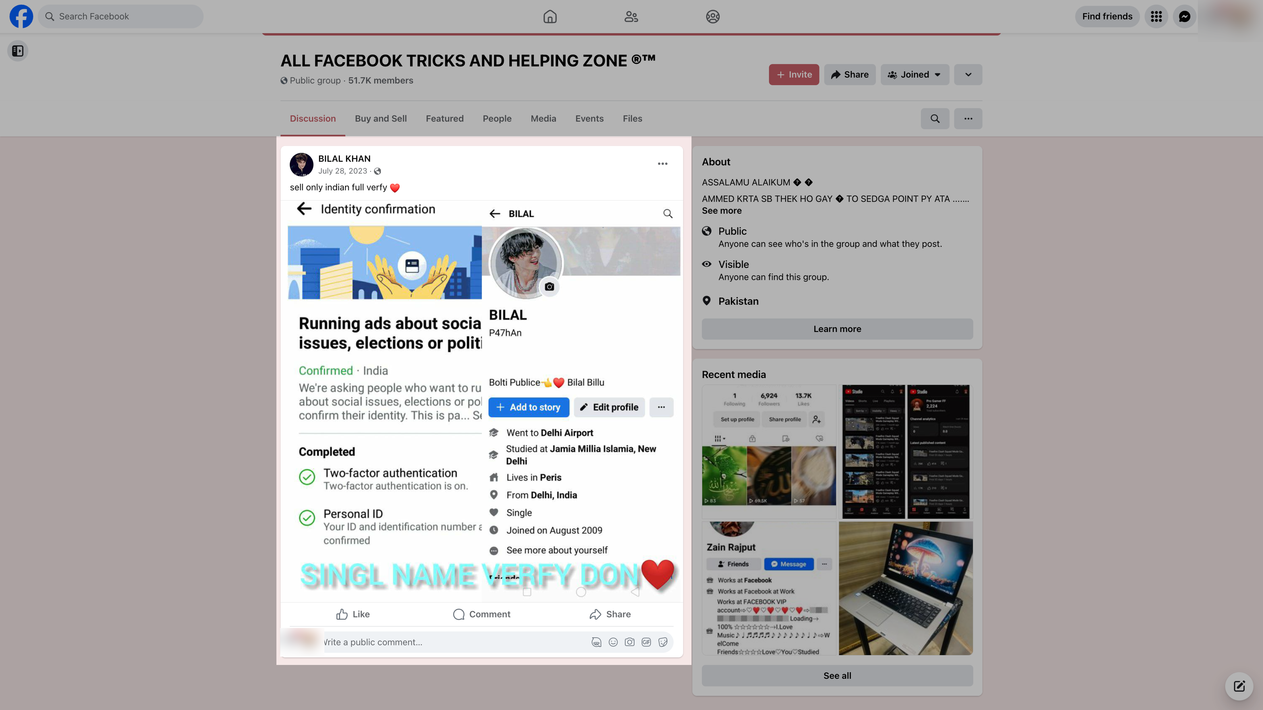 The user posted the message in a public Facebook group called “✔️Verified BM and FB Accounts Trusted Market ✔️” and on his personal Facebook page, getting positive replies from multiple users, including some in other countries. One reply came from a user who gave his location as Pakistan and had a Meta Verified blue checkmark next to his name. Meta (following the lead of Elon Musk’s X) turned the blue checkmark into a paid subscription service last year.