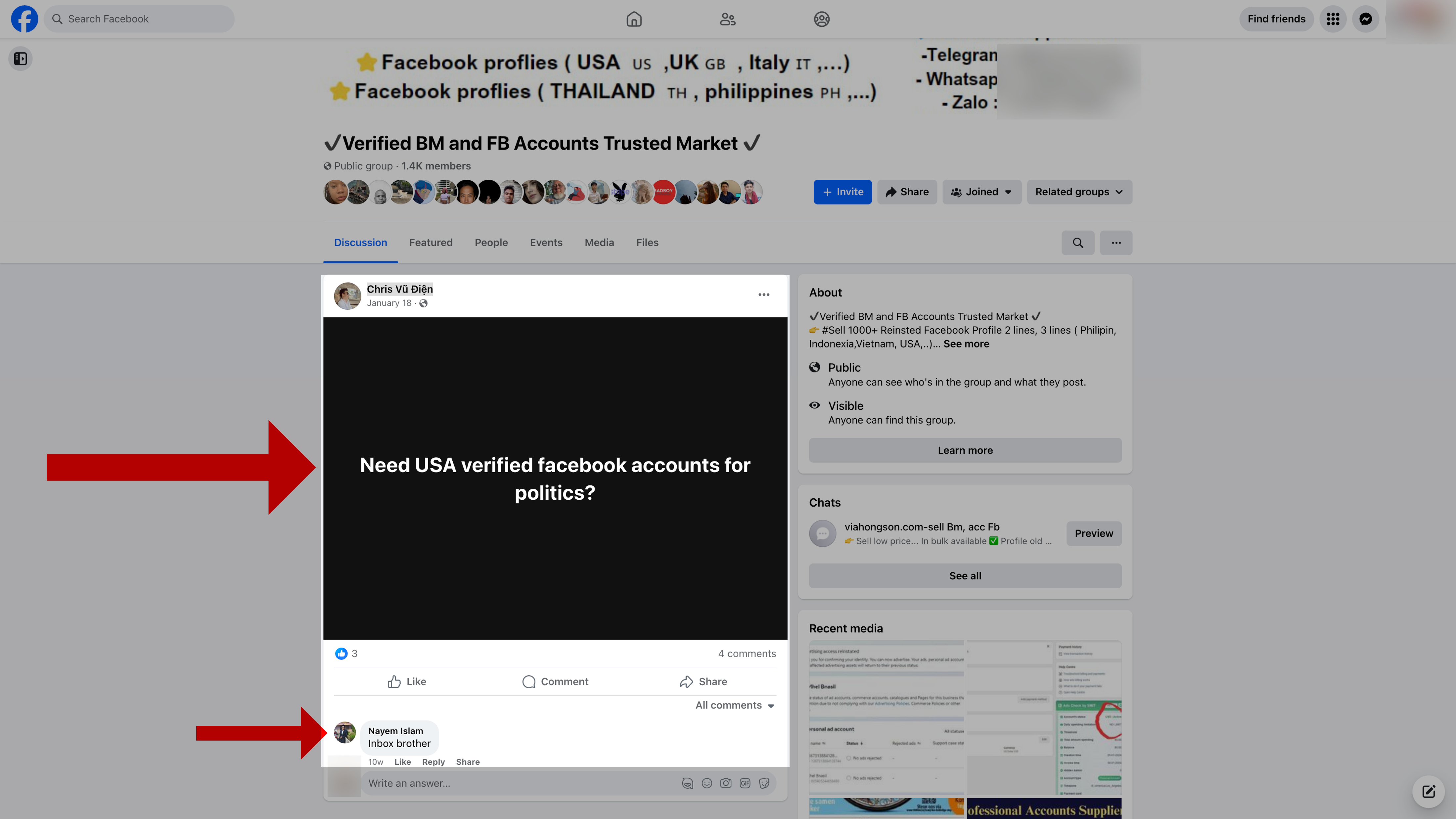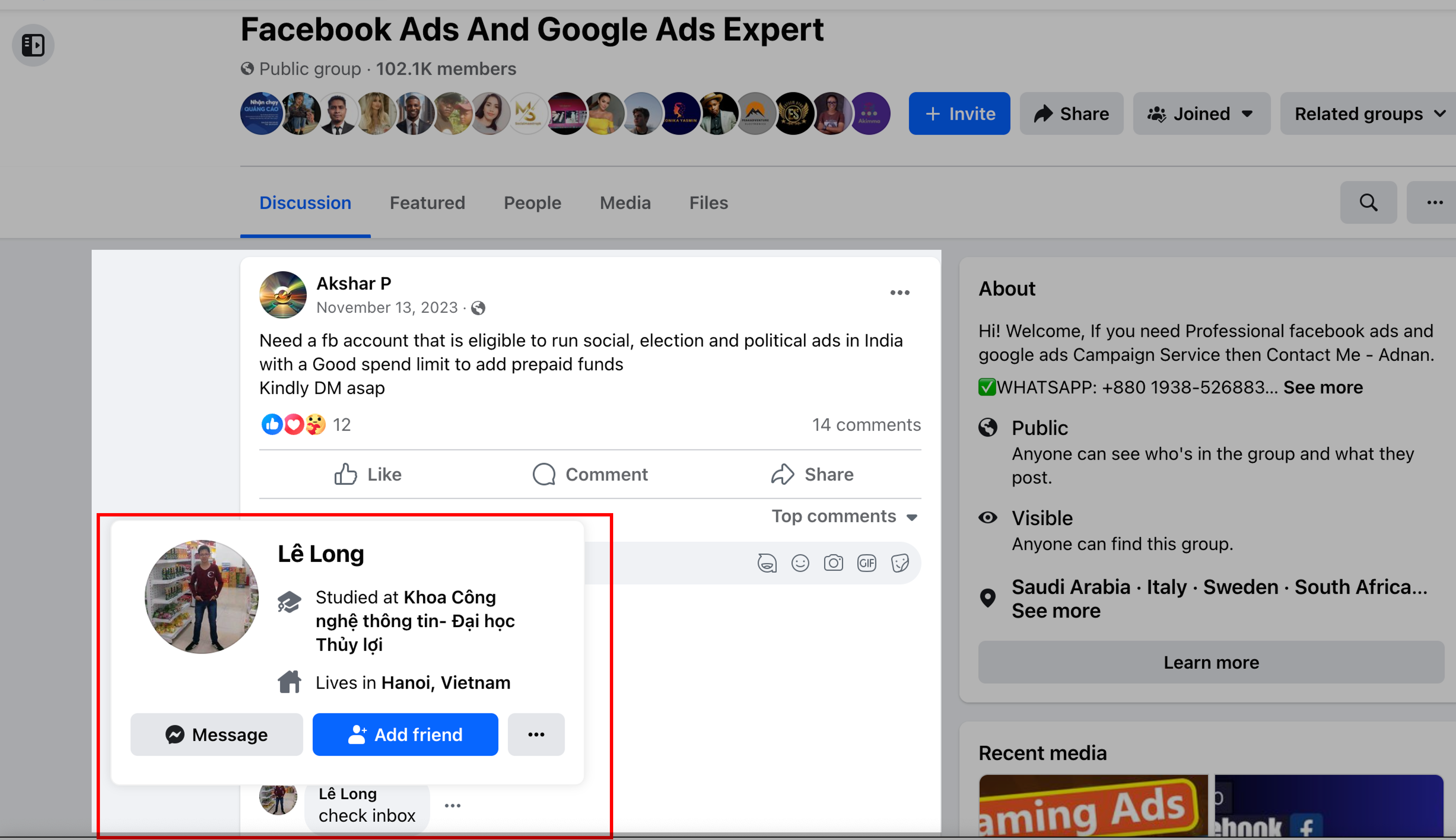 A user in another group called “Facebook Ads And Google Ads Expert,” with more than 102,000 members, posted in November 2023 that they needed a “fb account that is eligible to run social, election and political ads in India with a Good spend limit to add prepaid funds.” Multiple members of the group replied with offers to help, including one who gave his location as Vietnam—an indication of the borderless nature of this black market.