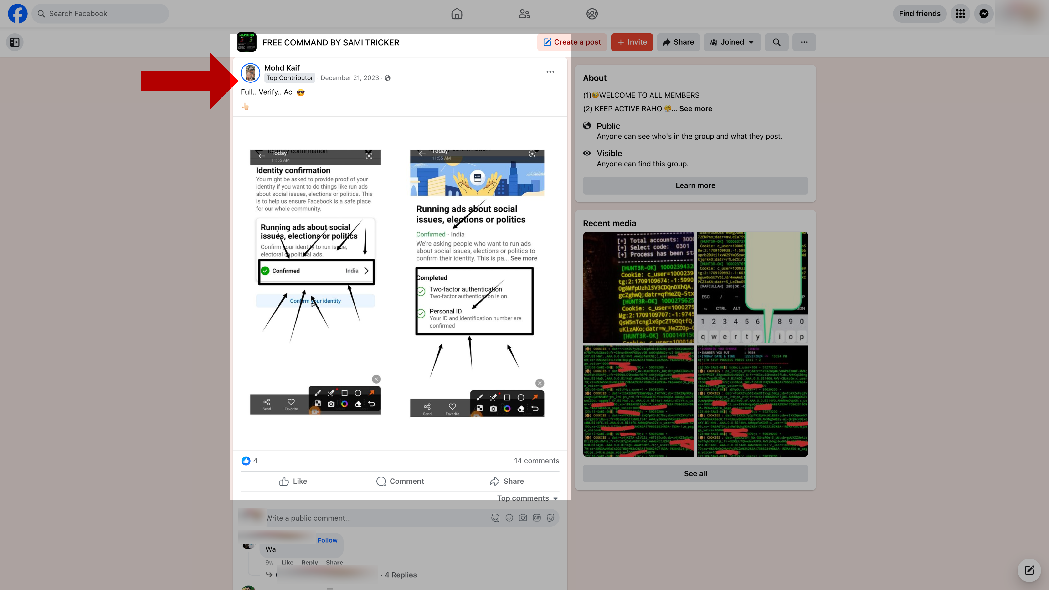 In a group called FREE COMMAND BY SAMI TRICKER, a user who posted about Indian accounts for sale in December 2023 had a “top contributor” badge, which Facebook awards to people for “being one of the most active participants” in a group. Meta evidently handed out this designation even though the group in question hosts a bustling trade in Facebook accounts, WhatsApp accounts, and Indian IDs.