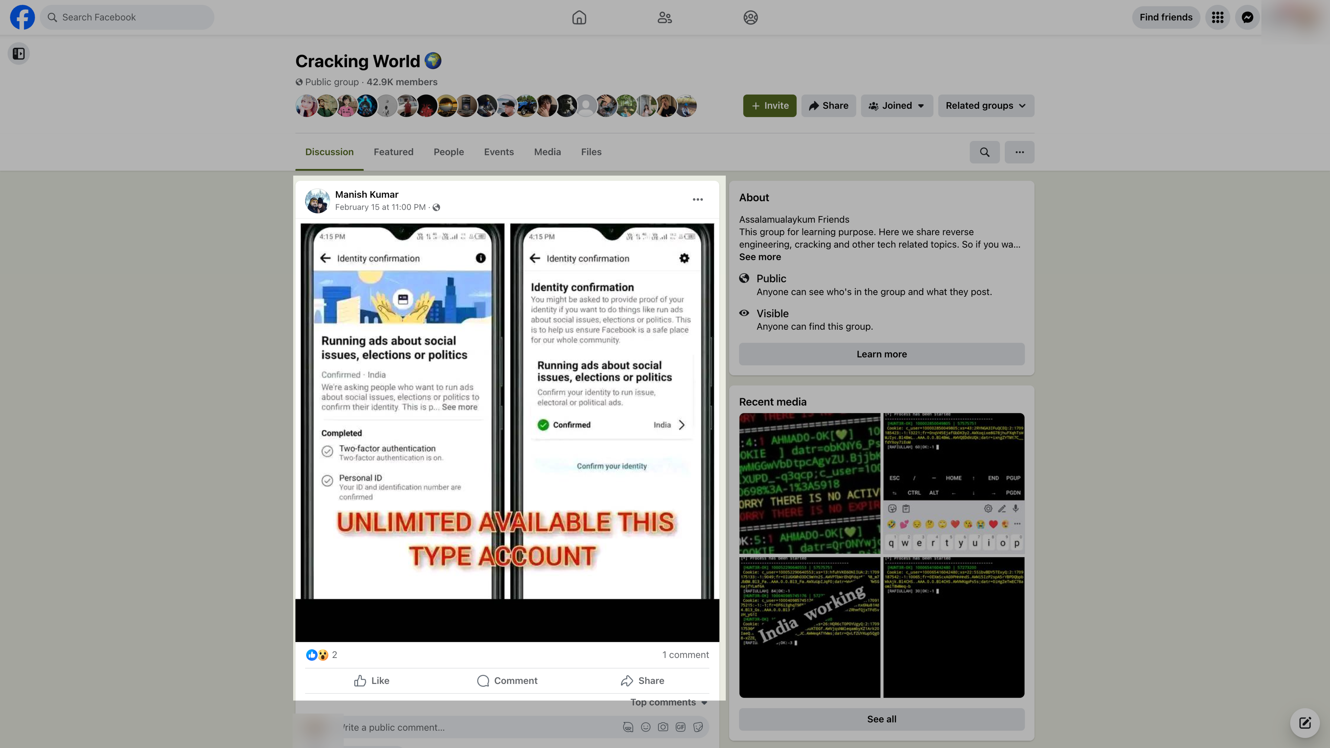 In February 2024, one user posted in a Facebook group called Cracking World that he had “unlimited” accounts approved to run political ads in India. The user’s Facebook page, which gave his location as Mumbai, India, stated that he is an “All Typ Facebook Account Seller.” The Cracking World Facebook group, which was created in 2022 and has more than 45,000 members, featured dozens of posts offering Facebook and other social media accounts for sale.