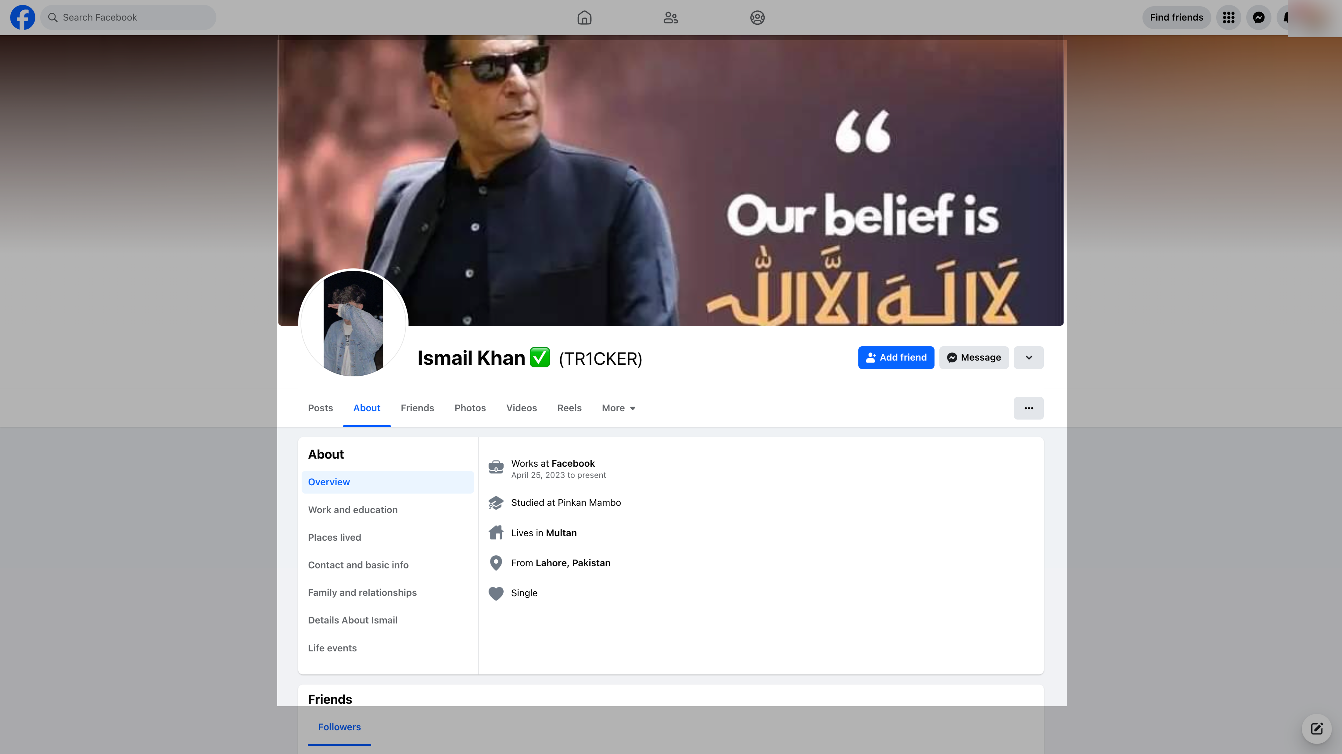 The first seller mentioned in this report, who posted in a Facebook group about “INDIAN VERIFIED ACCOUNTS AVAILABLE,” used his personal Facebook page to make a similar offer in February 2024. The about section of the page gives its location as Multan, Pakistan, which is noteworthy given the user is selling Indian accounts. The page’s cover photo is an image of Pakistan’s former Prime Minister Imran Khan.